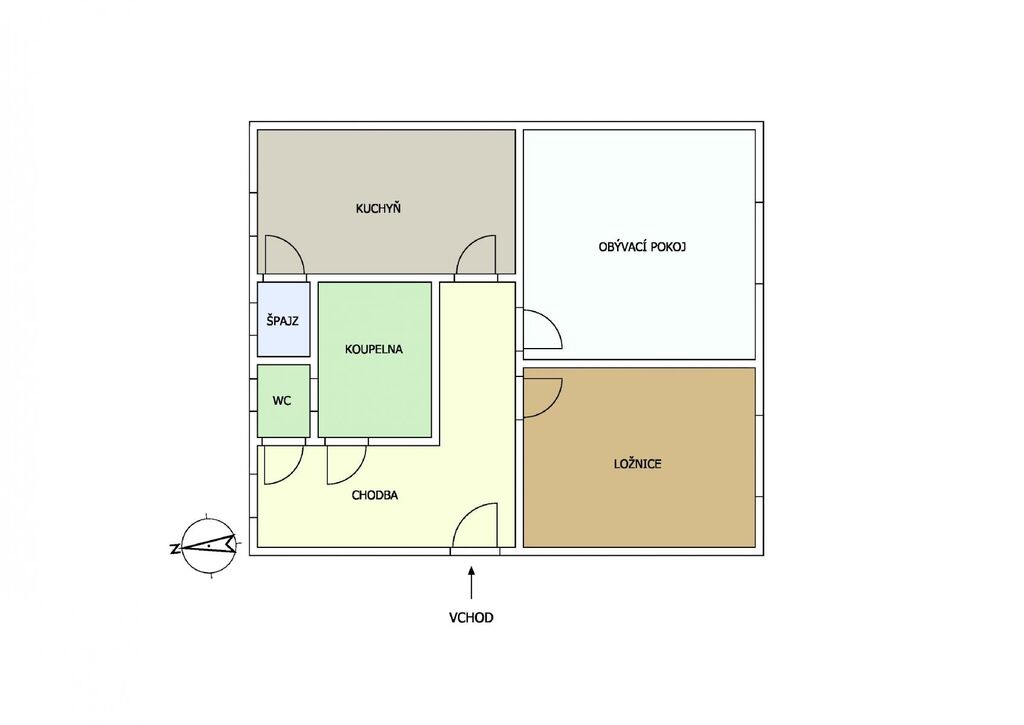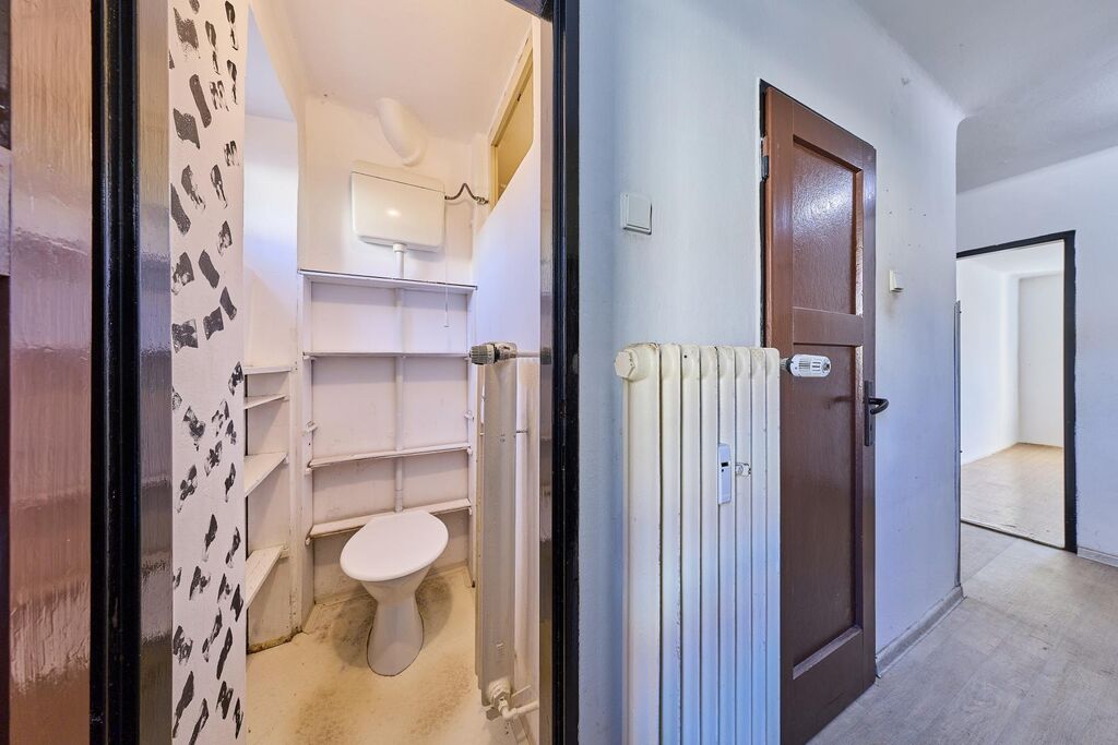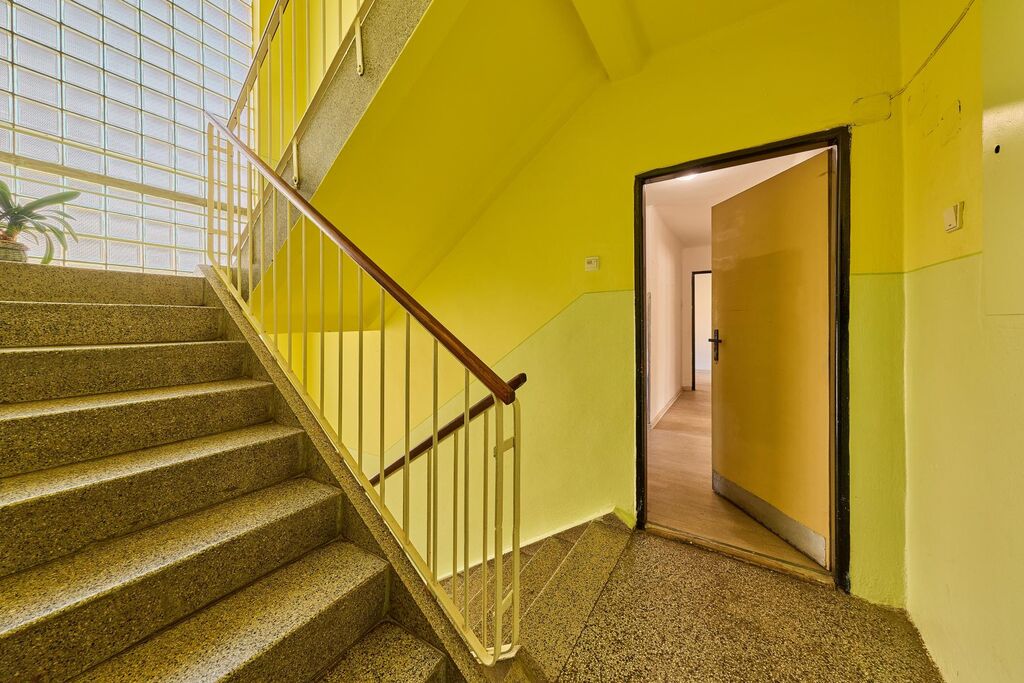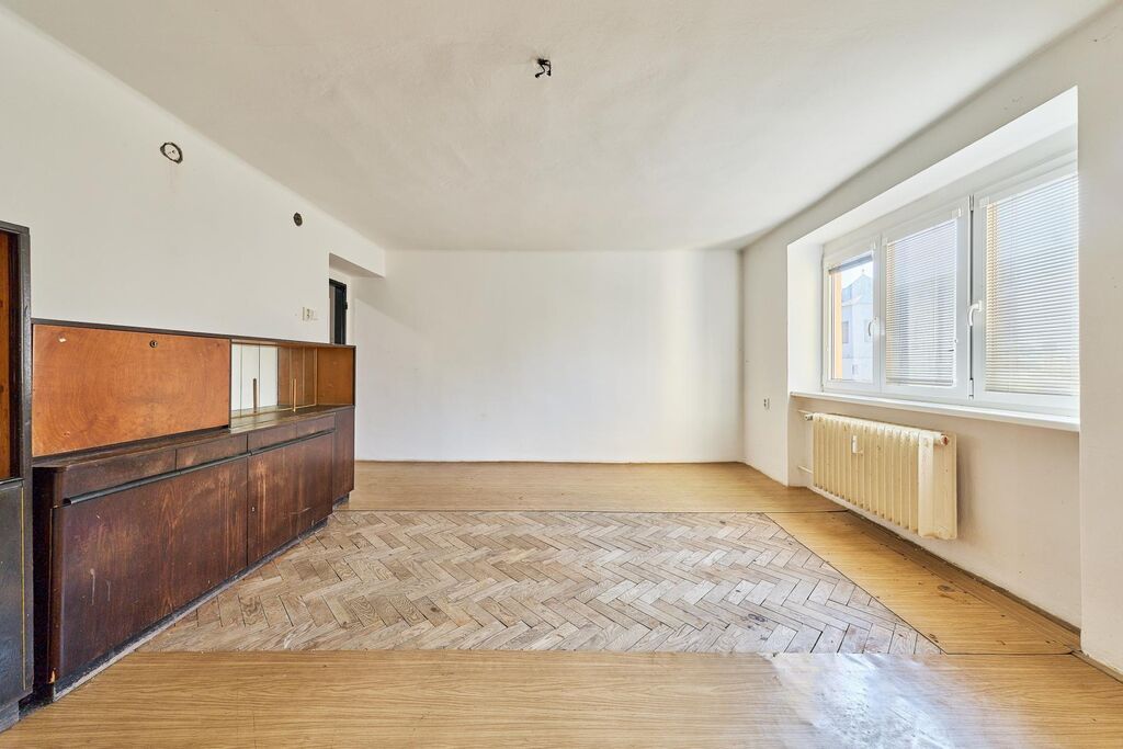 Dispozice bytu: prostorná vstupní chodba, kuchyně + spíž, obývací pokoj, ložnice, koupelna s vanou, samostatné WC. Okna bytu jsou orientována na sever (směr na Jiráskovo náměstí) a na jih. K bytu náleží kóje v suterénu domu. Byt má osazena nová plastová okna, jinak je v původním stavu, vhodný k rekonstrukci, avšak i nyní je pronajmutelný.
