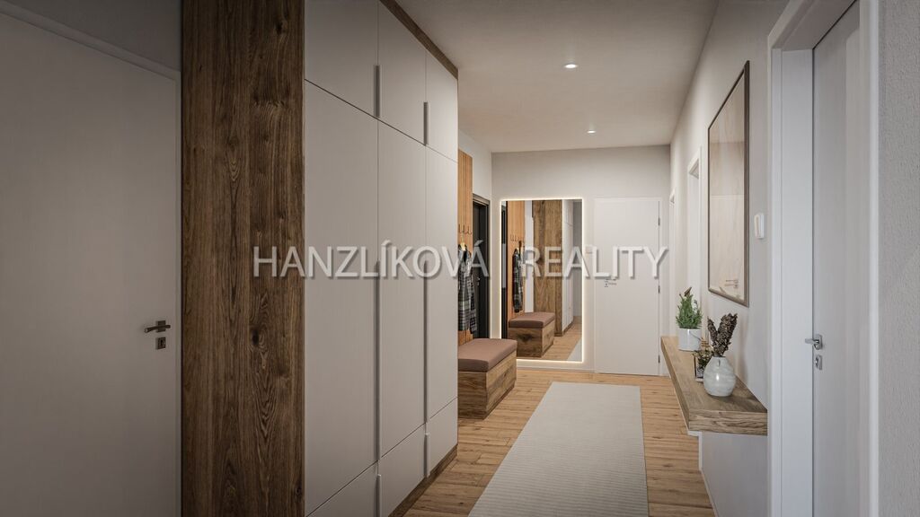 - prostorné chodby, která má dostatek místa pro vestavné skříně a úložné prostory, koupelny s vanou, sprchovým koutem, toaletou, místem na pračku a oknem, samostatné toalety, hlavní obytné části s kuchyňským koutem a jídelnou, dvou dětských pokojů a ložnice. Součástí bytu je balkon o výměře 11,85 m2 a sklepní kóje umístěná v suterénu domu.