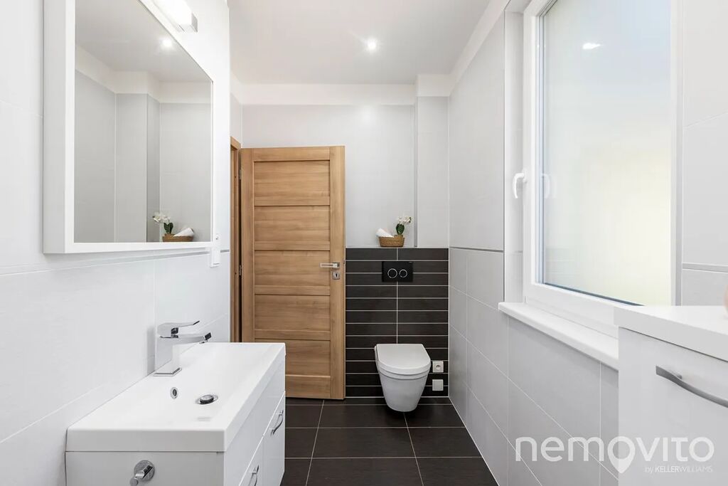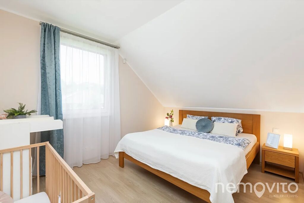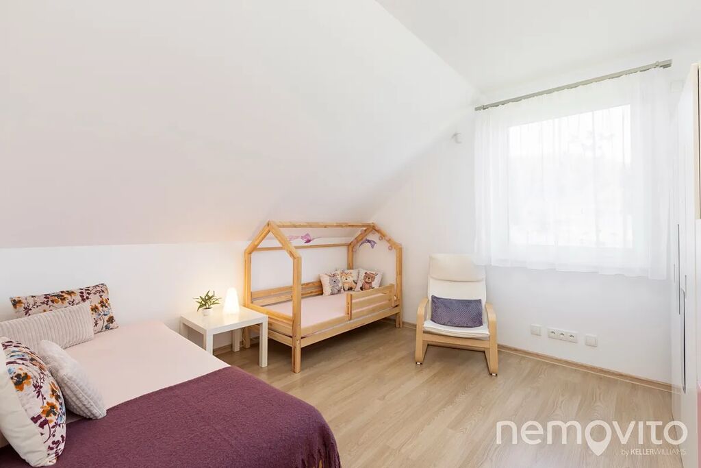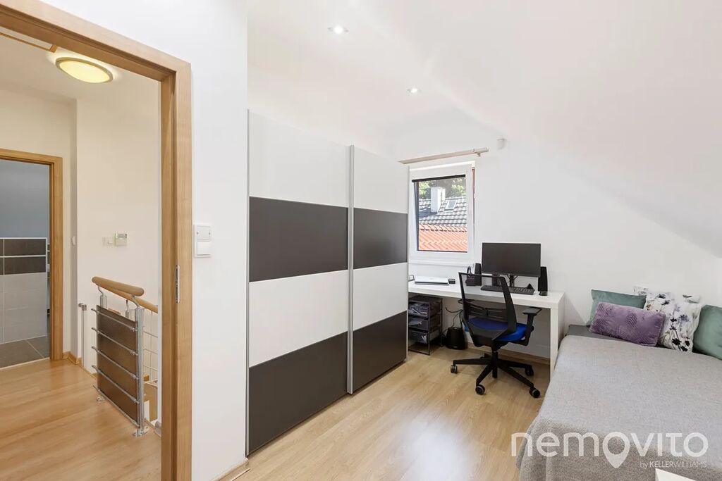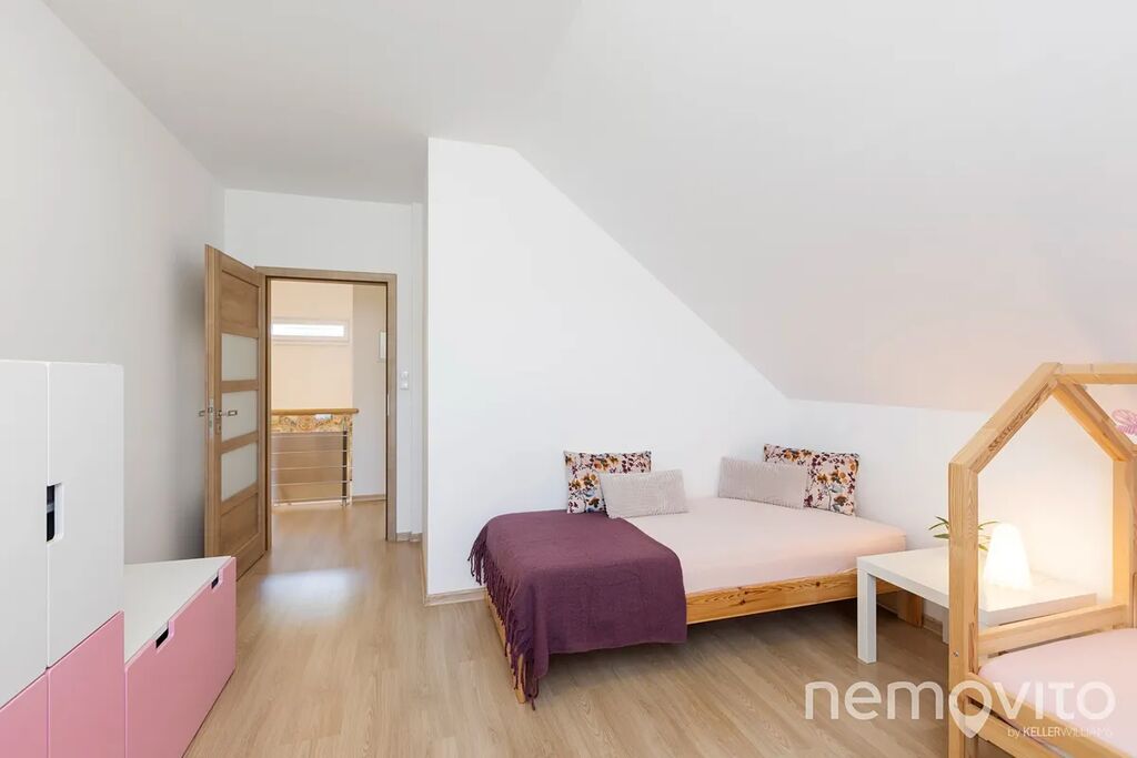 Všechny 3 ložnice jsou pak nahoře, přičemž k jedné náleží vlastní šatna. Velká koupelna s rohovou vanou má k dispozici klasické okno, přestože je v podkroví. To je využité beze zbytku, protože nad celým domem je velká půda, a to samé platí o prostoru nad krytým parkingem pro 2 auta s nabíječkou (cca 50 + 40 m2 na půdách). Porci úložného prostoru pak doplňuje ještě zahradní domek (ZP 25 m2) v zadní části zahrady, ve které nechybí také bazén. Výhled je volný směrem na pole, které je aktuálně stavebně nevyužitelné.