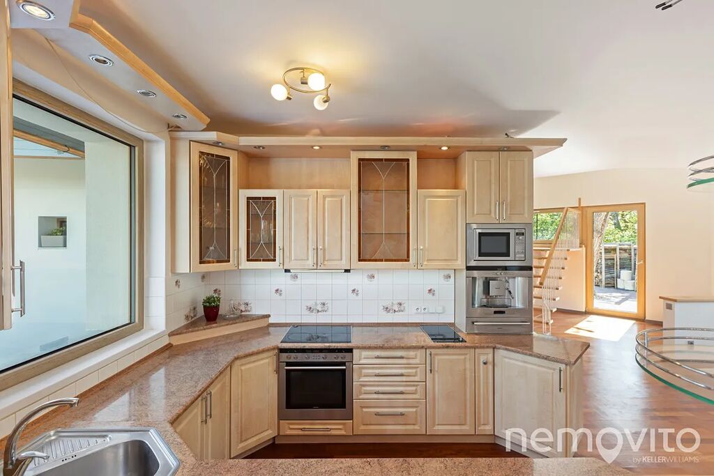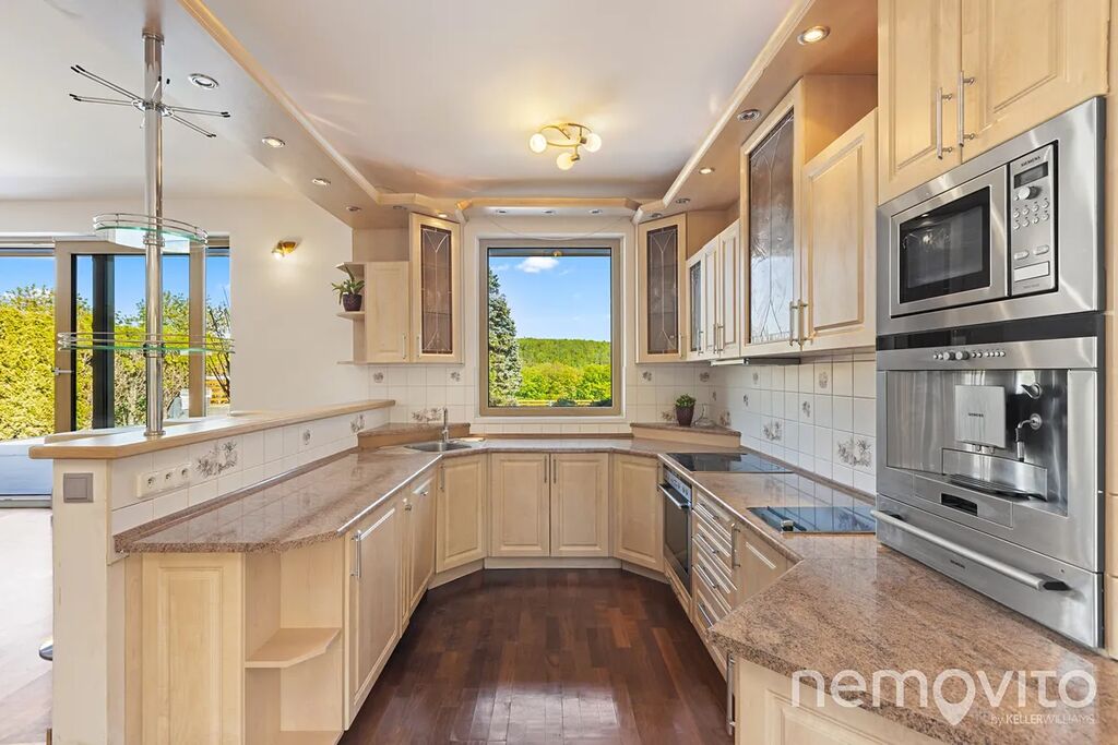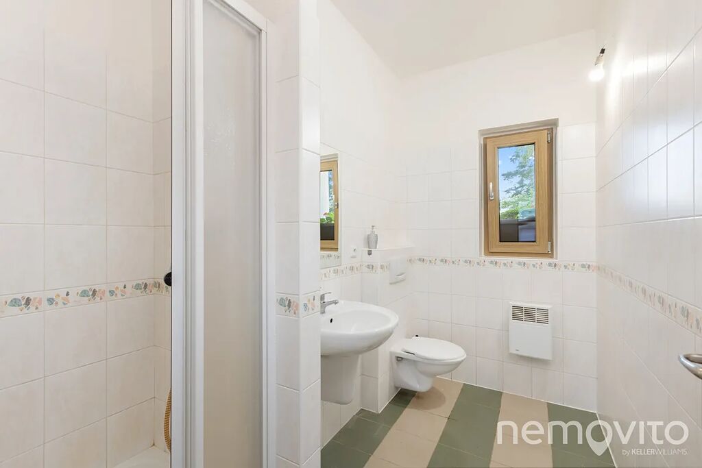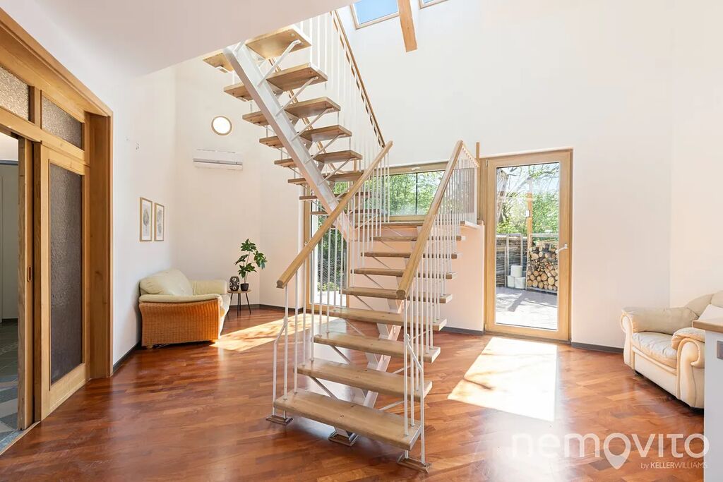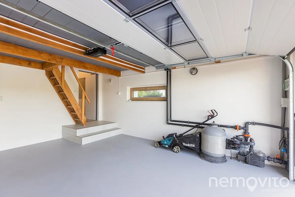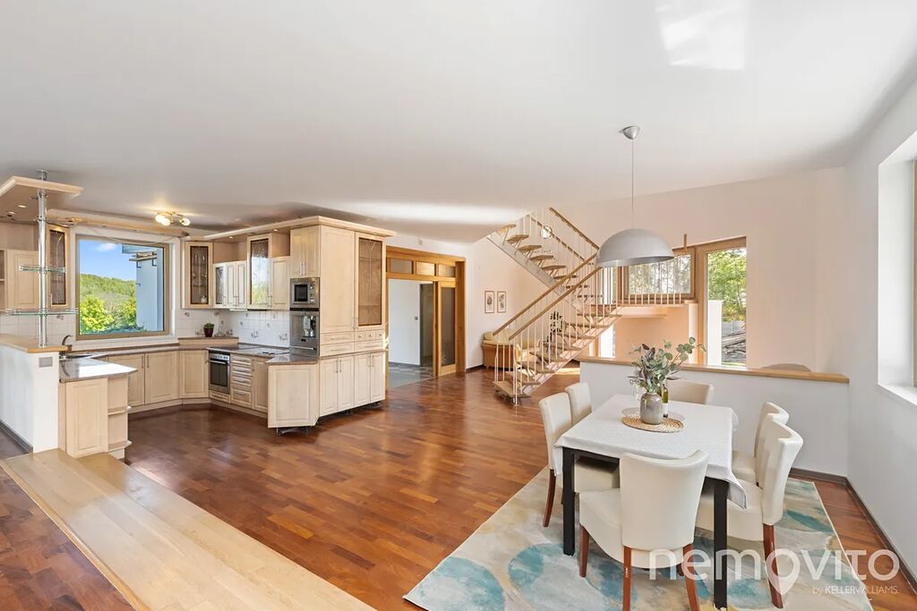 Dvoupodlažní stavba s obrovským obývákem (110 m2) nabízí skoro 300 m2 plochy s garáží, velkou půdou, malým sklípkem u bazénu a 4 koupelnami. Nechybí také řada úložných prostor v podobě technické místnosti nebo velké prádelny. Typická velkorysost domů z přelomu milénia, která však netrpí vysokými náklady na provoz. Dům je totiž zejména v letních měsících dle výpočtů PENB na hraně soběstačnosti (teoretická spotřeba 1 kWh na 1 m2 za rok).