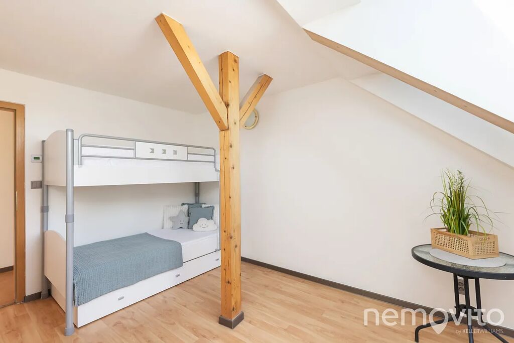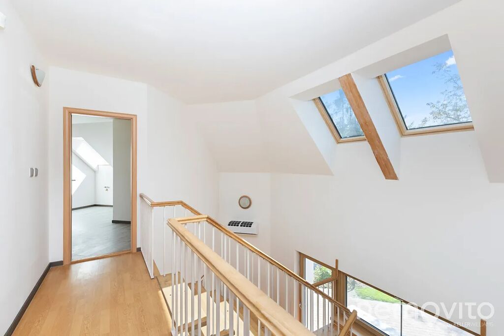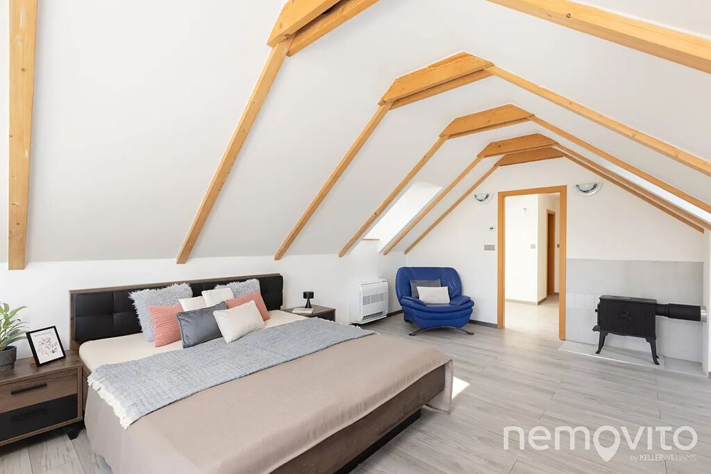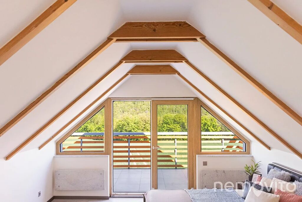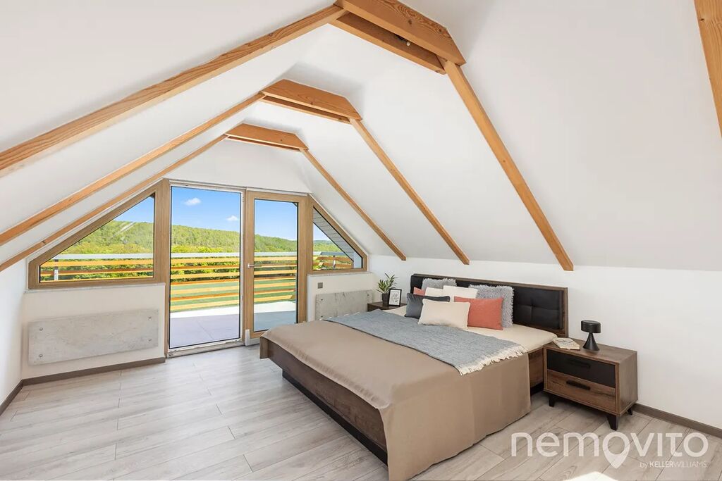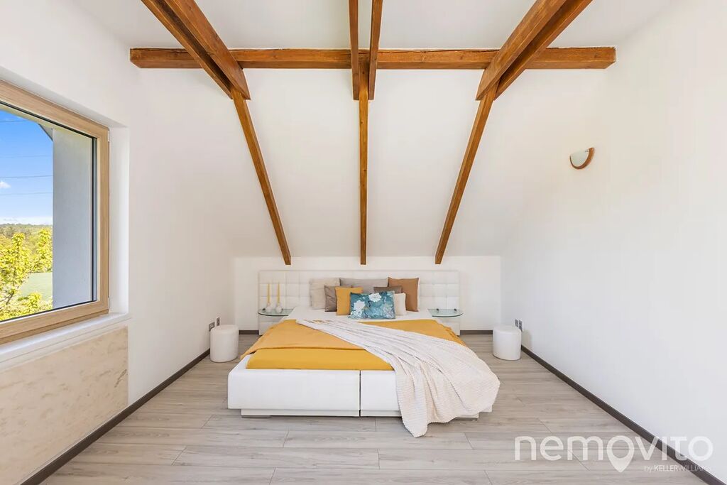 Dominantou je mimo zmíněného obýváku, ze kterého je výstup na terasu k bazénu, také hala se schodištěm, které propojuje obě podlaží. Všechny pokoje jsou nahoře, přičemž jedna z částí může fungovat zcela samostatně (vlastní koupelna, připojení na další kuchyni). V této ložnici s proskleným štítem je skutečně působivý výhled z balkonu, který je nad garáží. Následují dva menší pokoje a další sekce, která má vlastní koupelnu i šatnu. Nahoře jsou tak celkem 3 koupelny a možnost samostatného fungování dvou pokojů. Nechybí také velká, plně pochozí a čistá půda.