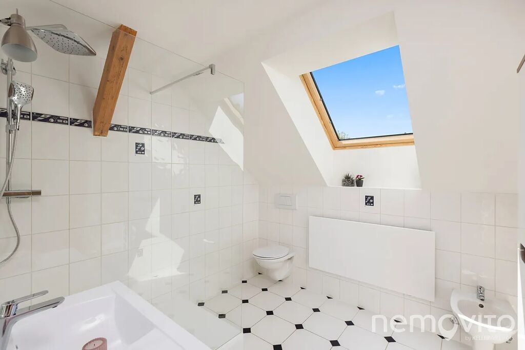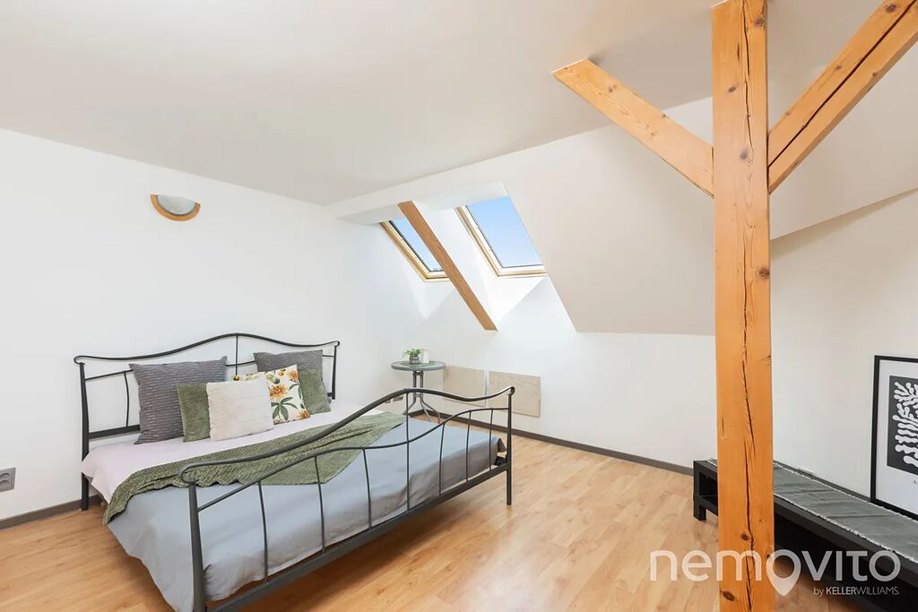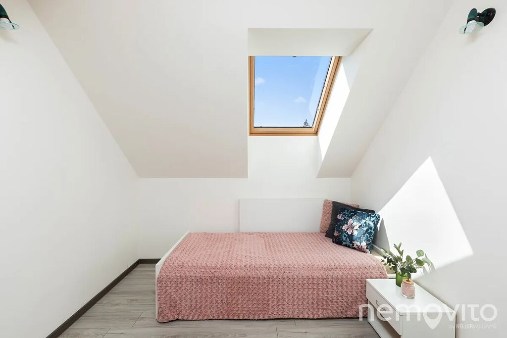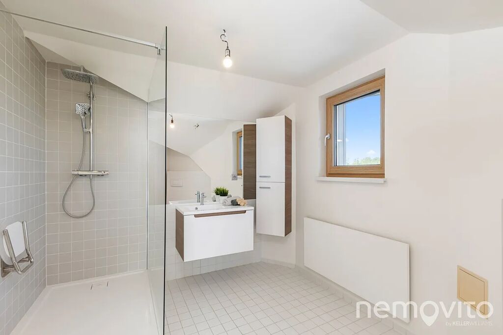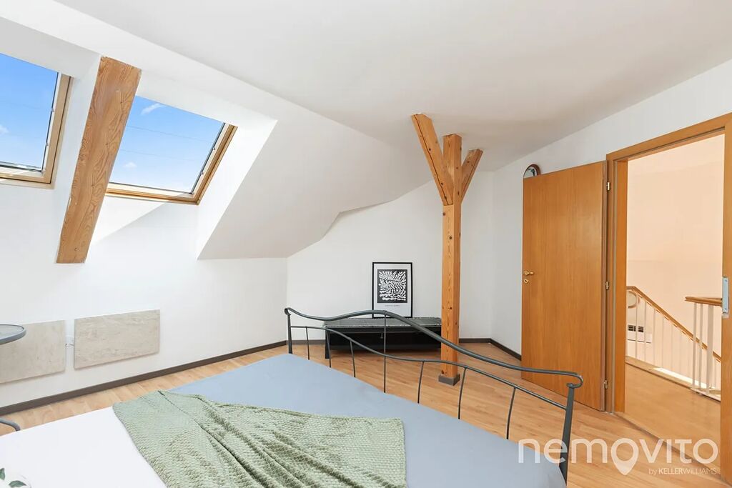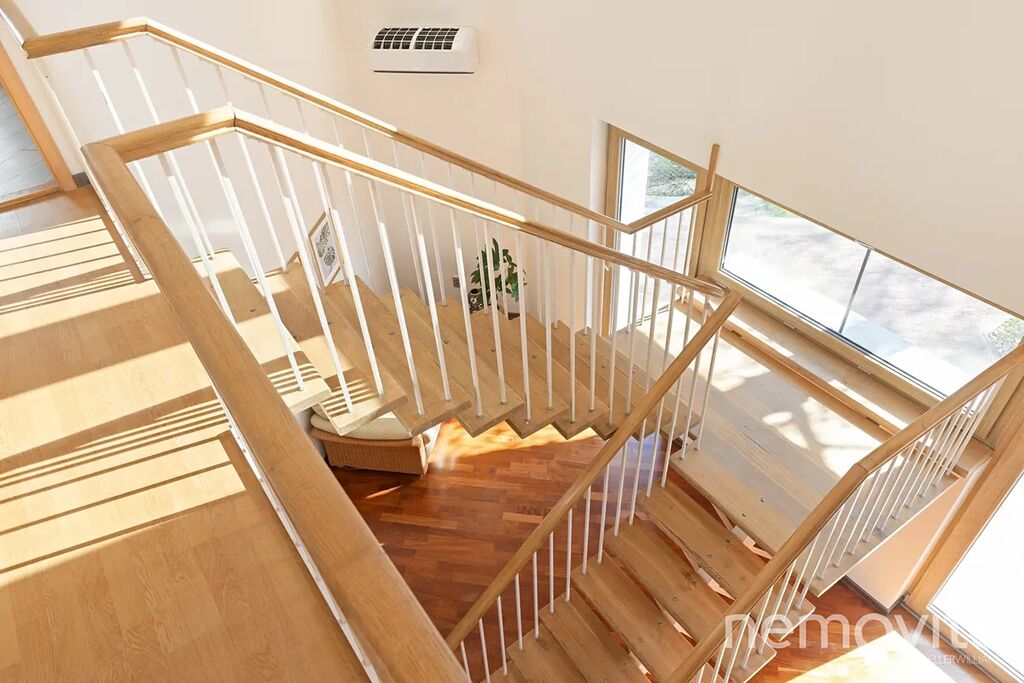 Dominantou je mimo zmíněného obýváku, ze kterého je výstup na terasu k bazénu, také hala se schodištěm, které propojuje obě podlaží. Všechny pokoje jsou nahoře, přičemž jedna z částí může fungovat zcela samostatně (vlastní koupelna, připojení na další kuchyni). V této ložnici s proskleným štítem je skutečně působivý výhled z balkonu, který je nad garáží. Následují dva menší pokoje a další sekce, která má vlastní koupelnu i šatnu. Nahoře jsou tak celkem 3 koupelny a možnost samostatného fungování dvou pokojů. Nechybí také velká, plně pochozí a čistá půda.