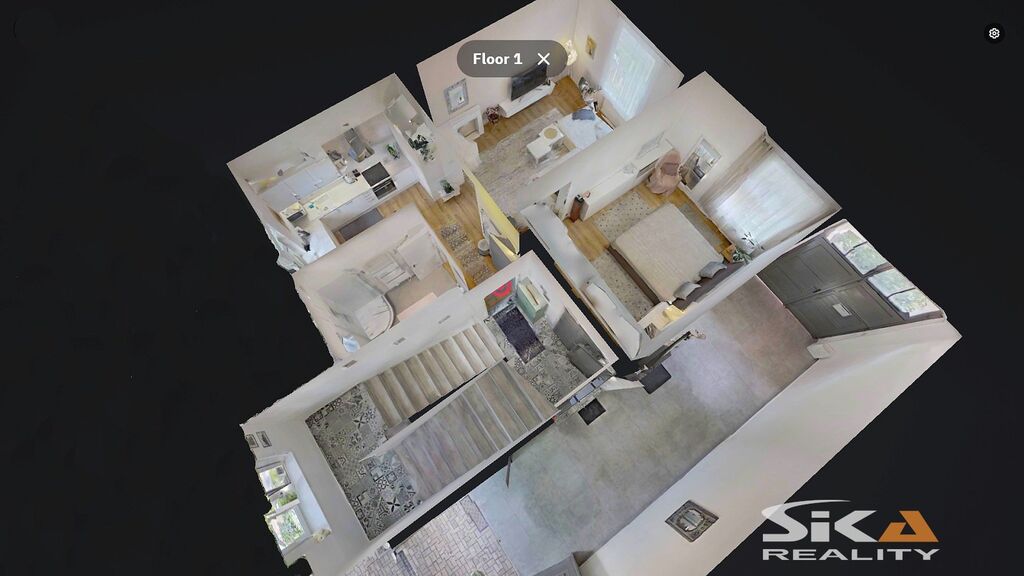 Do domu se vstupuje průjezdem, který propojuje zahradu domu s ulicí Jeronýmova, z průjezdu se vstupuje do prostoru schodiště, kterým lze nastoupat do vyšších poschodí, nebo sejít do prostoru sklepa. Z hlavní podesty v 1.NP je přístupný nabízený byt, kdy vlevo od vstupní chodby je umístěna koupelna se sprchový koutem, společná s toaletou, rovně z chodby vstoupíme do kuchyně (s okny do dvora), napravo od kuchyně jsou umístěny obývací pokoj a ložnice (s okny do uliční části).