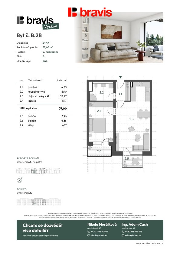 Nabízíme k prodeji moderní byt označený B.2B o dispozici 2+kk o užitné ploše 57,66 m² v novém developerském projektu Rezidence Haná ve Vyškově. Rezidence Haná přináší moderní a komfortní bydlení v atraktivní lokalitě Vyškova.