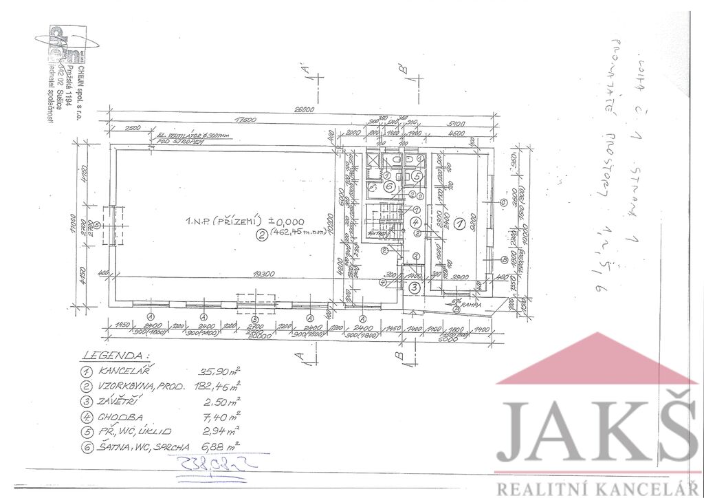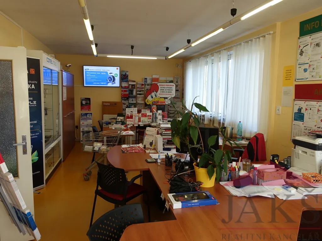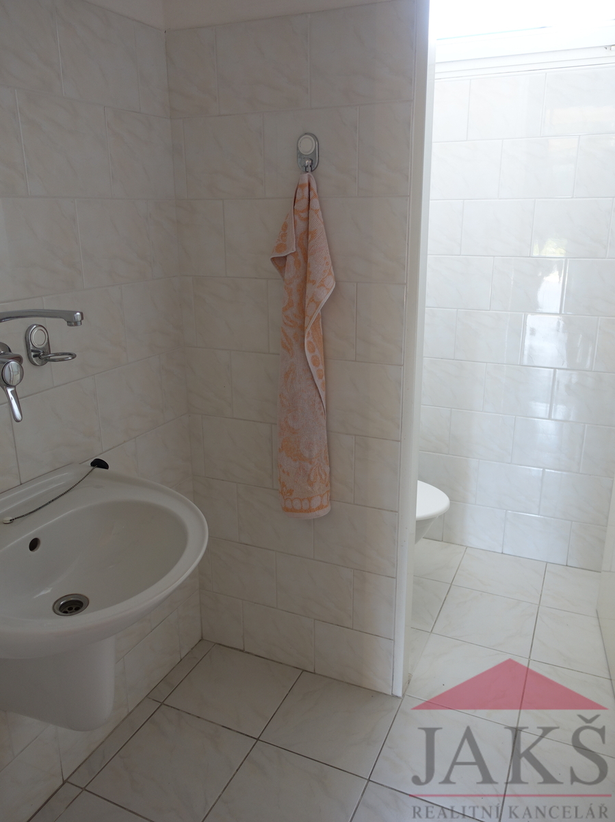 Popis: skladovací hala (dvoje vrata o šířce 2,4 a 2,7 m) o velikosti 182,46 m2 s rozměry 10,2 m x 16,7 m + 2,5 m x 4,2 m a výškou 3,7 m, prodejna či kancelář 35,9 m2, chodba 7,4 m2, sociální zařízení 2,94 m2 (WC, umyvadlo) a denní místnost 6,88 m2 (kuchyňka, sprcha, šatna).