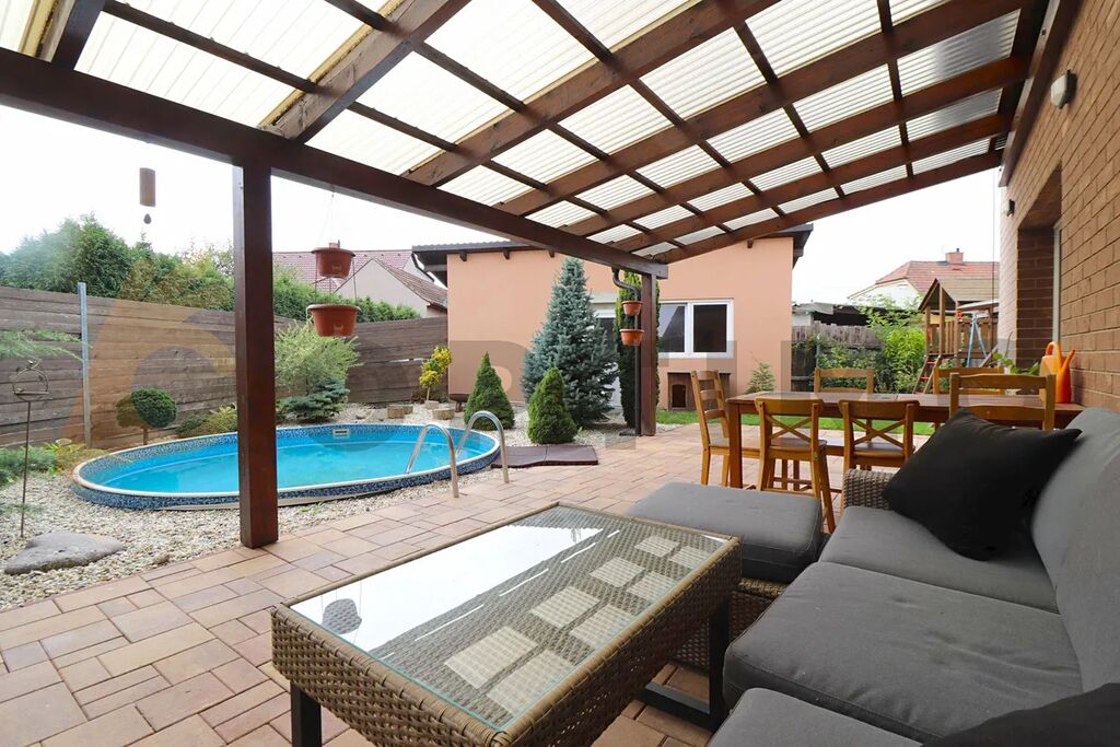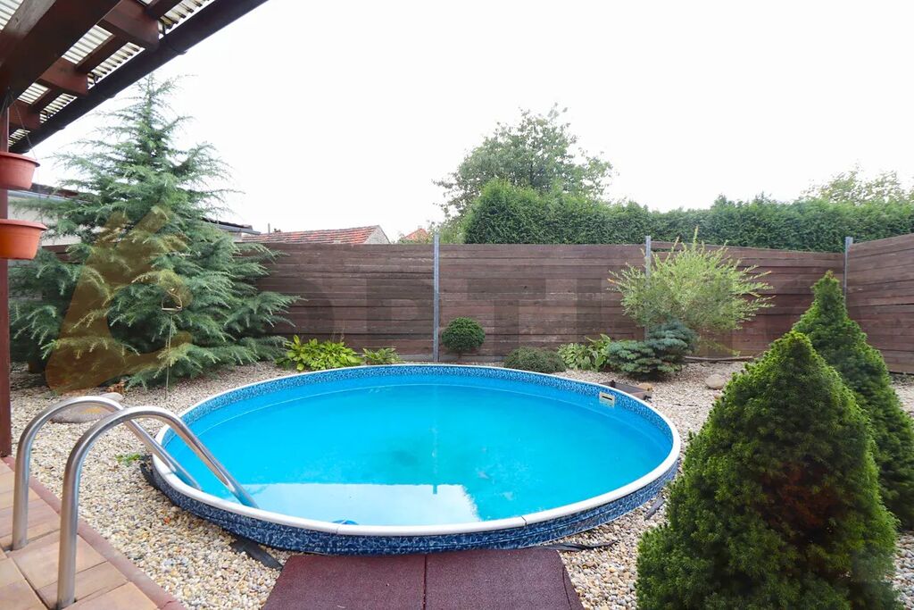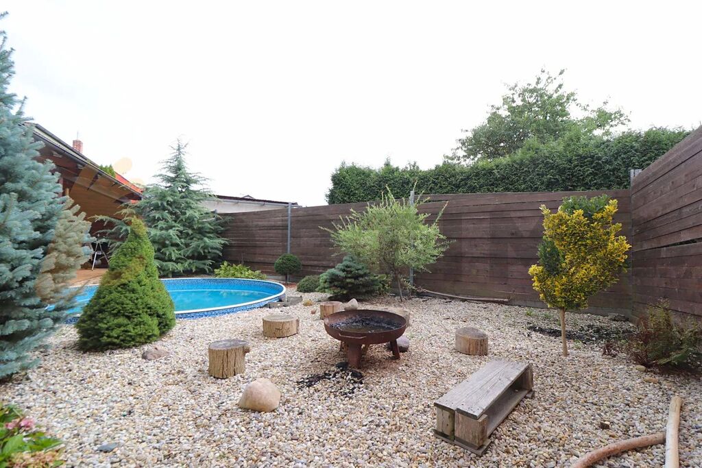 Pozemek o velikosti 458 m² je dostatečně velký na rodinné zázemí, nabízí bazén (průměr 3,6 m) i cihlový zahradní domek (22 m²). Součástí zahrady je navíc ovocný kout s mladými stromky – moruše, dvě jabloně a třešeň – a prostor pro vlastní pěstování, kde jsou již připravené záhonky. Jen několik minut chůze od domu začíná les, ideální pro procházky, sport nebo prosté nadechnutí se čerstvého vzduchu po hektickém dni.