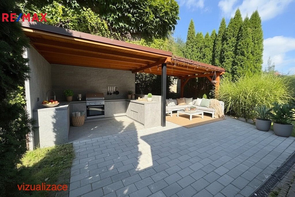 Na zahradě najdete pergolu pro klidné posezení s rodinou a přáteli i menší hospodářskou budovu, kterou lze přestavět třeba na venkovní kuchyni. Velký pozemek pak nabízí prostor pro zahradničení, odpočinek nebo bazén.