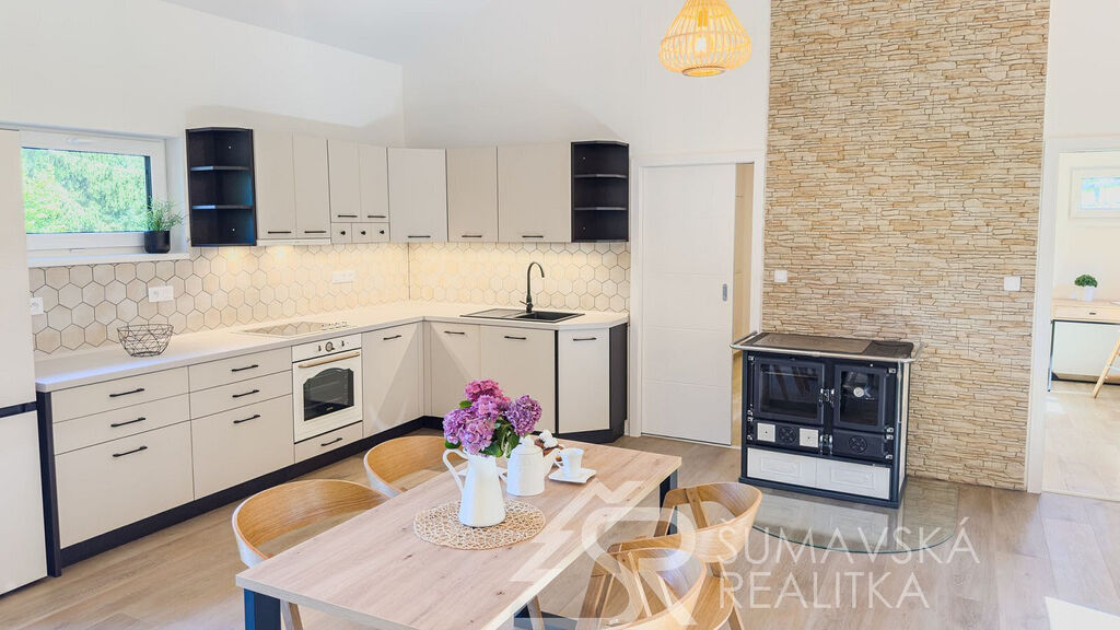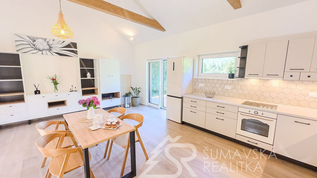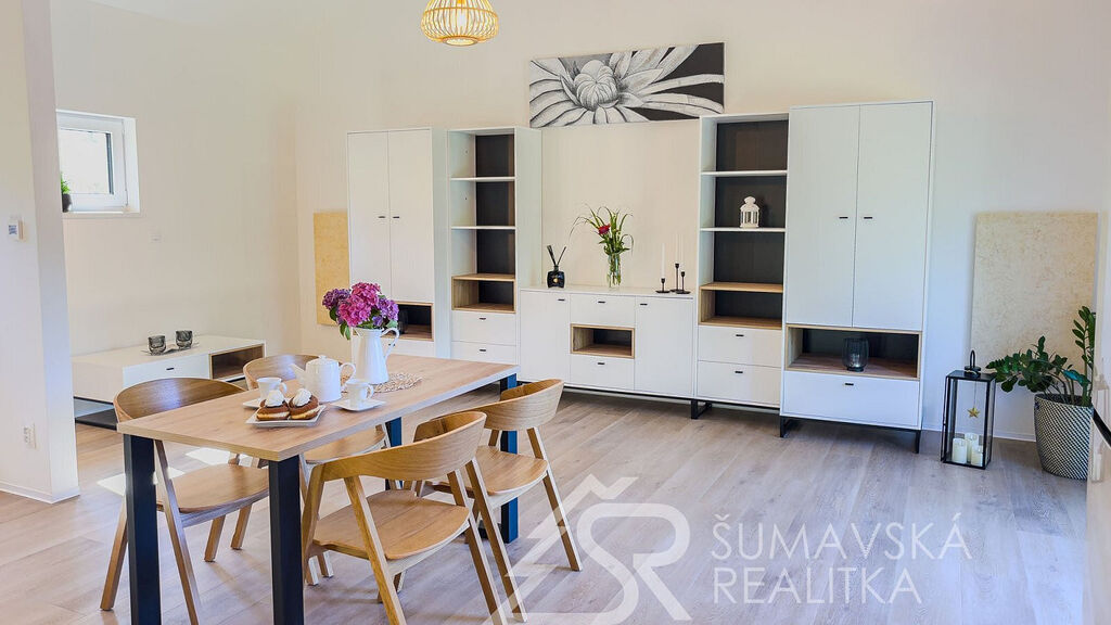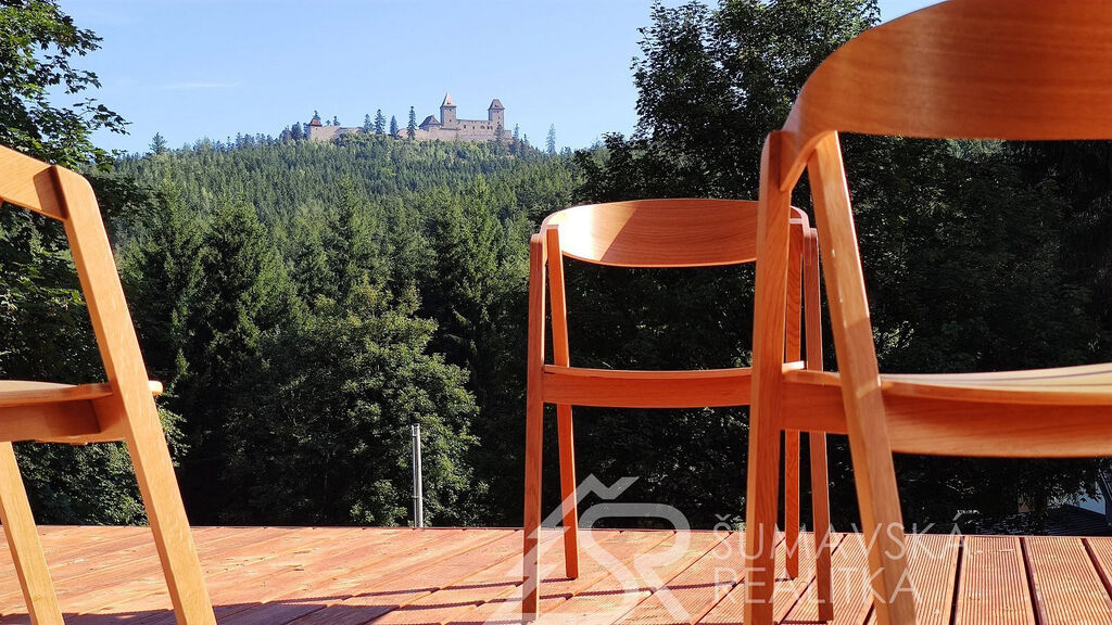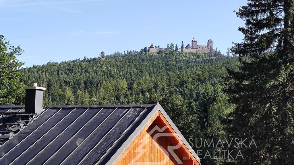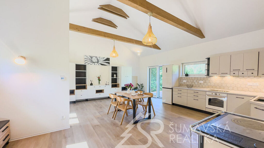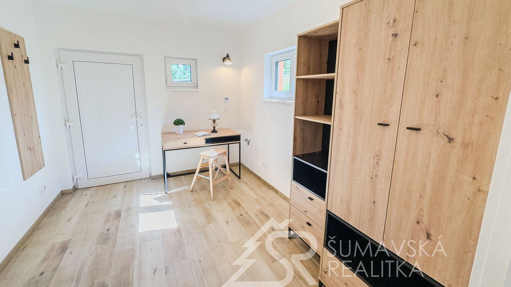 Vnitřní dispozice: 2kk s příslušenstvím. Hlavní místnost 42,5 m² je otevřená do krovu s částečně přiznanými prvky vazby, což vytváří velkorysý prostor s navazující terasou, jemuž dominuje nádherný výhled na hrad Kašperk. Je vybaven moderním nábytkem a rohovou kuchyňskou linkou MONARCH se spotřebičemi GORENJE – el. varná deska, digestoř, trouba, myčka, kombi lednice. Vše sladěné s interiérovými prvky – obklady, vinylovou podlahou, svítidly – a vše nové, nikdy nepoužité – viz video a fotogalerie. Přilehlá místnost 10,2 m² využitelná variabilně má i vlastní vchodové dveře. Vytápění obou místností mramorovými elektrickými sálavými panely zn. EUROTOPIN s komfortní regulací (nízká sazba) – pro útulnou atmosféru doplněné sporákem s troubou a plotnou zn. NORDICA s externím přívodem vzduchu a kapacitou vytopení obou místností. V obou místnostech příprava na TV. Koupelna 6,5 m² s nadstandardní sanitou SIKO – rohová sprcha, WC, umyv., el. bojler ARISTON VELIS 80, příprava na pračku se sušičkou. Koupelna má el. podlahové vytápění.