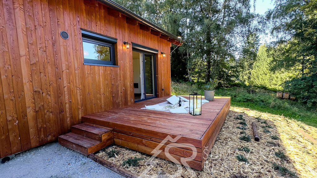 Popis stavby: atypická komfortní novostavba se zast. pl. 77 m², . real.2024-25, zkolaudovaná v lednu 2025. Kvalitní dřevostavba se sedlovou střechou krytou falcovaným plechem SATJAM Rapid DeLux je zvenku kompletně obložená modřínem a má parametry obytné nemovitosti určené k celoročnímu využití v horských podmínkách. Byla realizována specializovanou firmou EASY HOME Plzeň jako individuální záměr na klíč – kompletně od základů až po nadstandardní sanitu a detaily – např. el. ovládané venkovní rolety a vnitřní žaluzie. Všechny interiérové dveře jsou posuvné do pouzder. Okna plastová s izolačními trojskly.