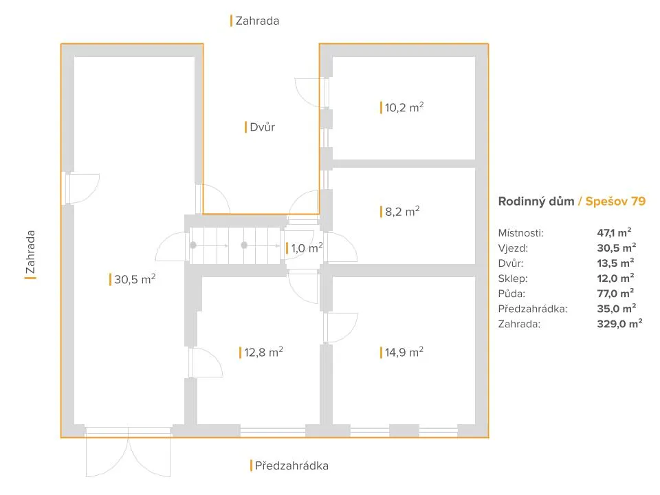 Přístup do domu zajišťuje prostorný vjezd, kde je možné parkovat, za domem se pak nachází dvůr (13,5 m²), zahrada s ovocnými stromy (višeň, hrušeň, jabloň, ryngle), studnou, suchým WC a přiléhající železniční tratí Brno - Česká Třebová. Díky tomu je lokalita velice dobře napojena na větší města, kam dorazíte veřejnou dopravou během pár minut.
