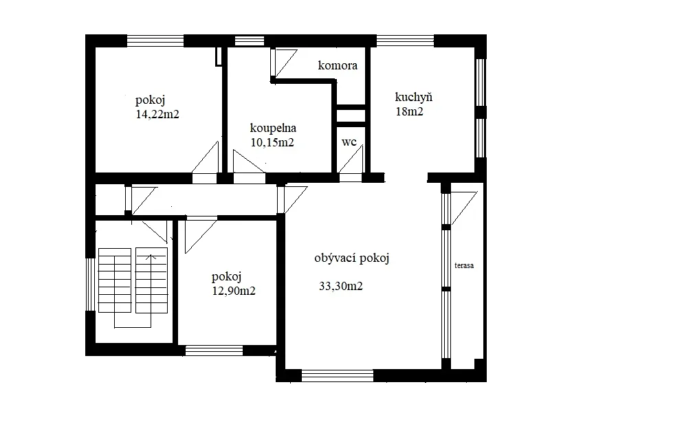 V 2. nadzemním podlaží se nachází se samostatným vstupem byt 3+1. Z bytu je vstupe na nedokončenou prostornou terasu.