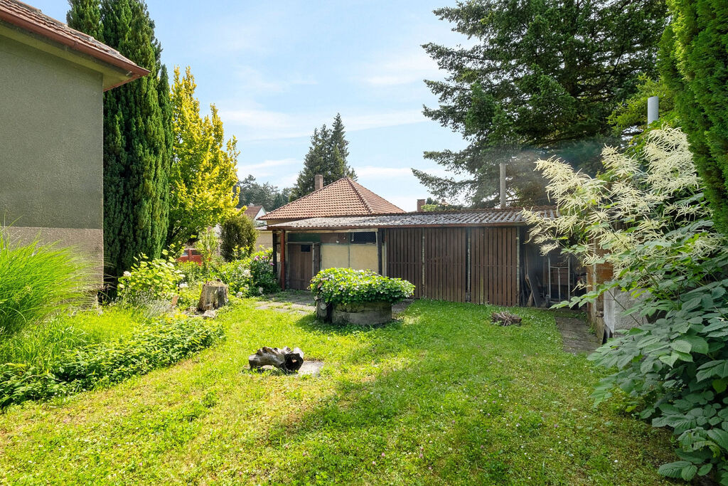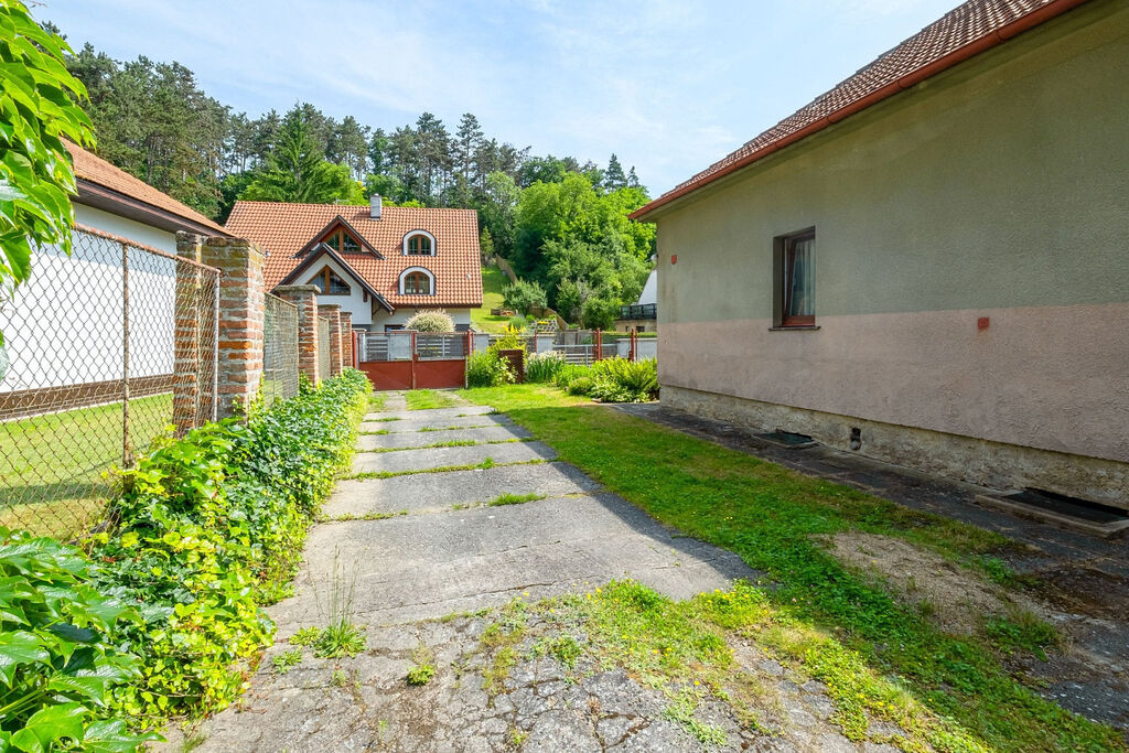 Pozemek je oplocený, mírně svažitý a pečlivě udržovaný. Najdete zde ovocné stromy, okrasné keře, květiny, kůlny, udírnu, nádrž na vodu i studnu na zalévání. U domu je také garáž a technická místnost.