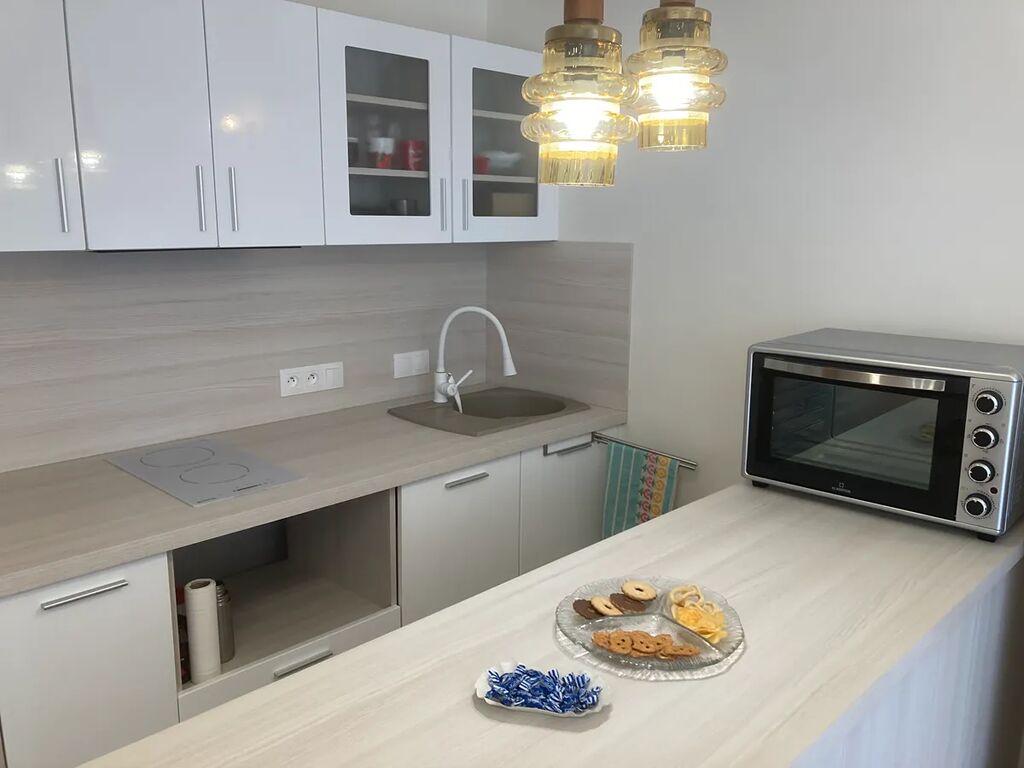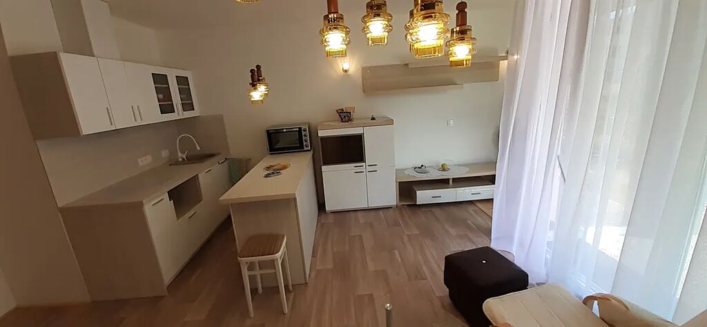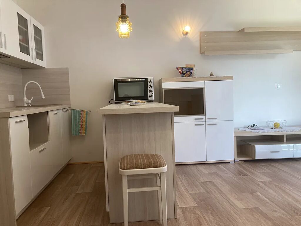 Obytná místnost s kuchyňskou částí vybavenou moderní designovou kuch.linkou se spotřebiči (myčka, lednice, trouba, varná deska) navazuje na odpočinkový prostor pro postavení postele či rozkládacího gauče. Rohová část pokoje je zařízena skříněmi na zavěšení oděvů i úložnou částí se šuplíky. Určitě rádi využijete i skryté zrcadlo.