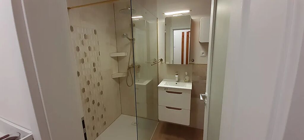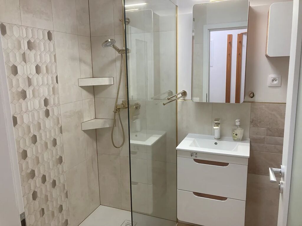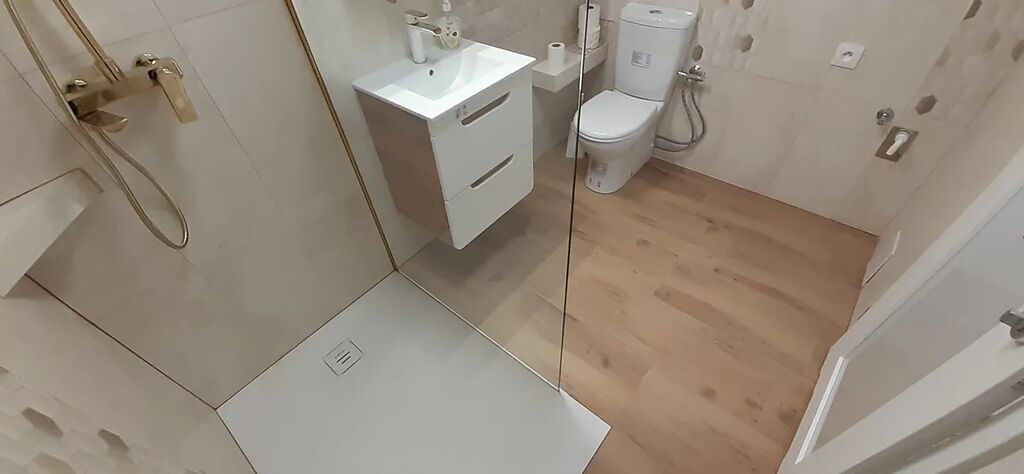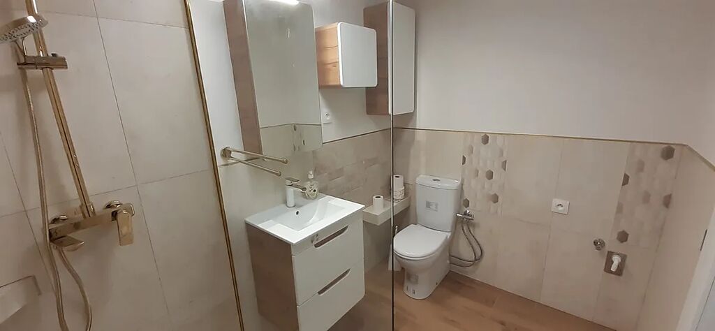 Okouzleni budete koupelnou s krásným prostorným sprchovacím koutem, umyvadlem, toaletou i místem pro pračku.
