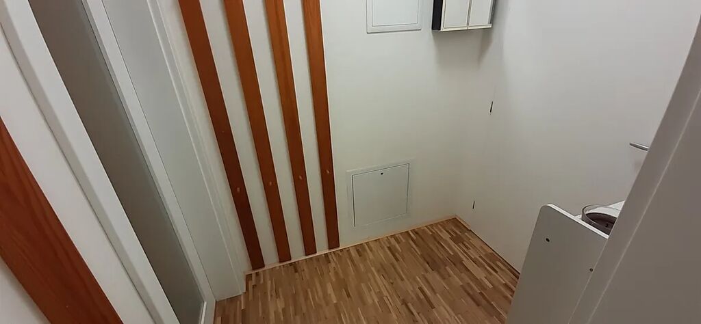 Podlahy jsou v kombinaci dřevěných parket, vinylu a dlažby.