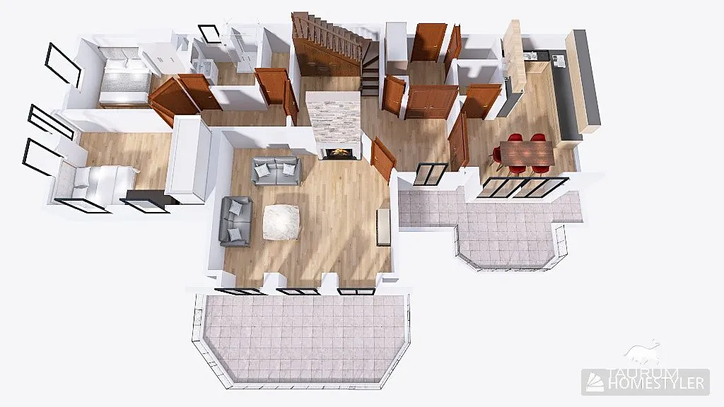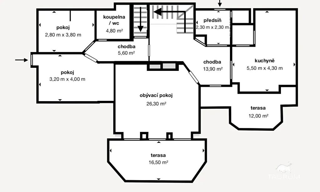 Ve prvním podlaží se nachází předsíň, kuchyně, obývací pokoj s oboustranným krbem, dva samostatné neprůchozí pokoje, koupelna s toaletou, úložné prostory a dvě terasy přístupné z kuchyně a obývacího pokoje.