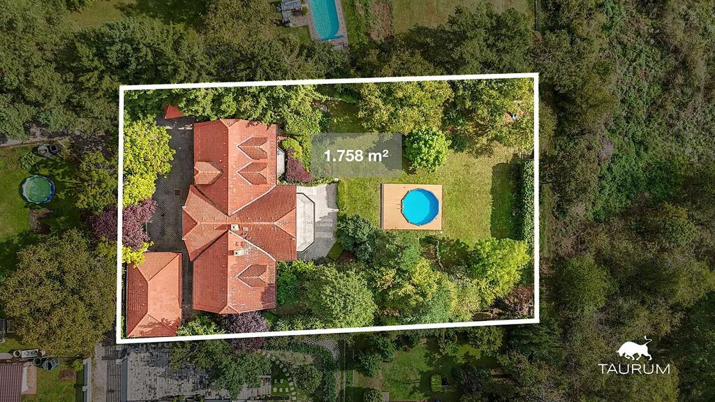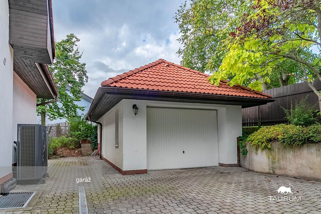 Na pozemku stojí garáž o výměře 23 m² s jedním parkovacím stáním. Další parkovací místa jsou v prostoru před garáží u vchodu do domu. Celková výměra pozemku je 1.809 m², a to včetně vlastní příjezdové cesty. Samotná zahrada má rozlohu 1.566 m² a je ve velmi hezkém, udržovaném stavu, s množstvím zeleně a kruhovým bazénem.