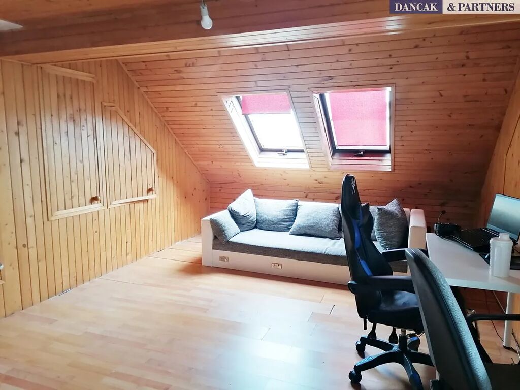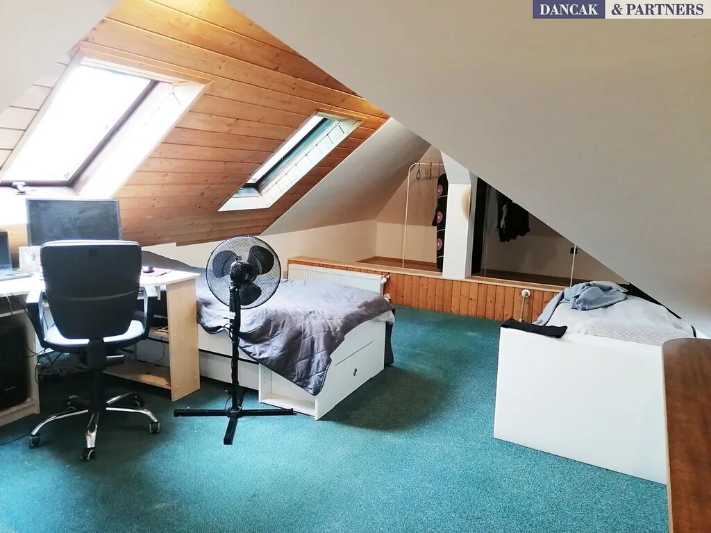 Z chodby je vstup na schodiště vedoucí do podkroví, jež nabízí k využití další místnost, kterou je možno využít jako pokoj pro hosty, z té je přímý vstup na střešní terasu ideální pro letní posezení i grilování.