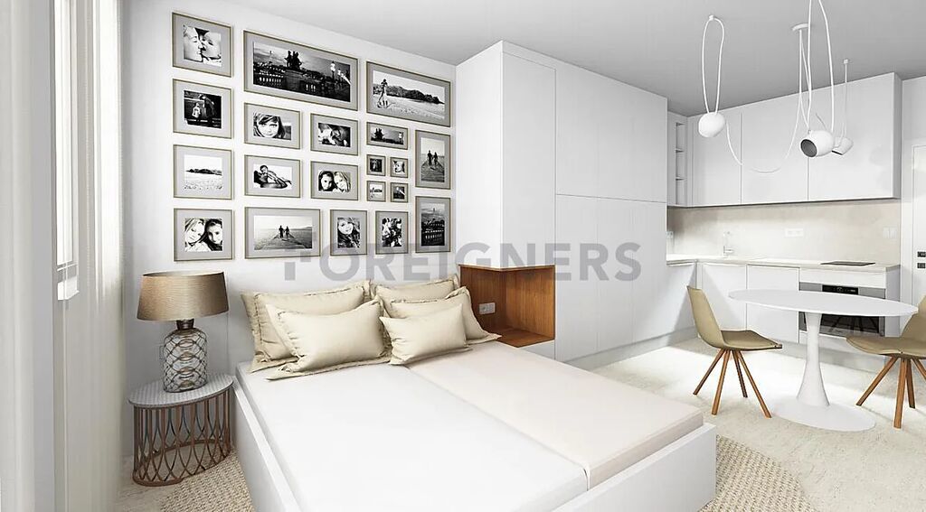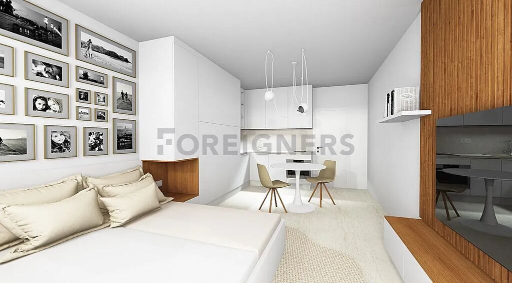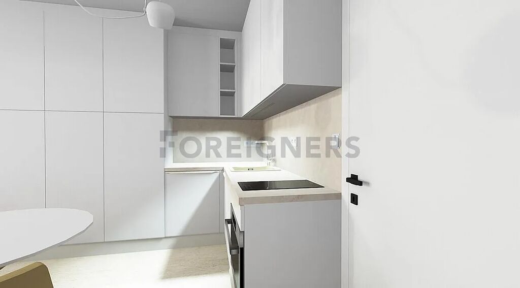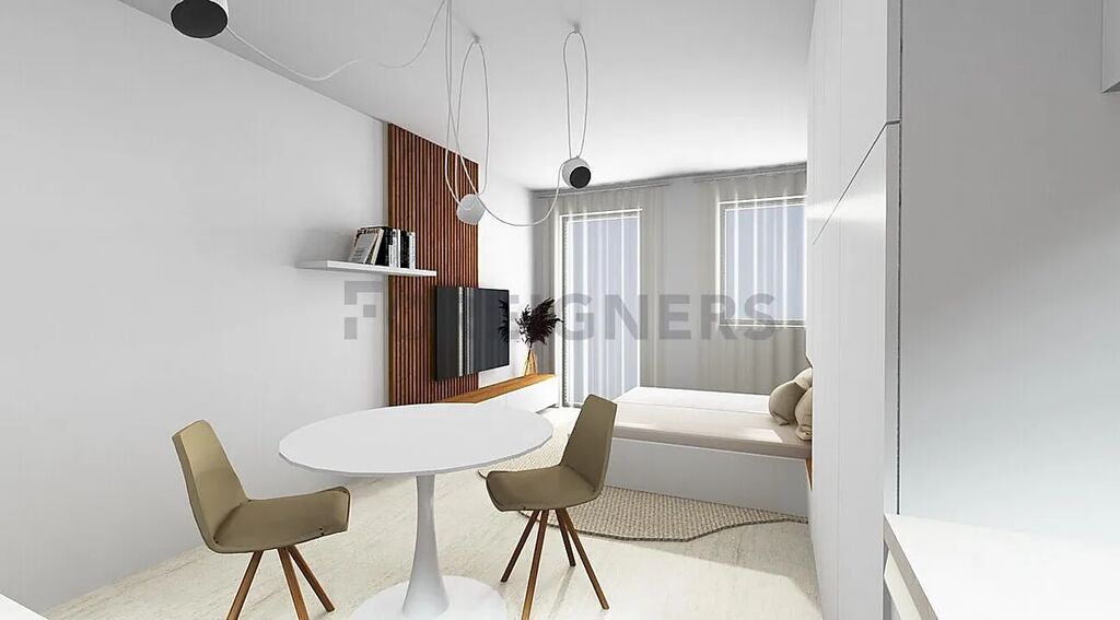 Hlavní část bytu tvoří světlý obývací pokoj s kuchyňským koutem a vstupem na balkon. Kuchyňská linka je vybavena vestavnými spotřebiči – lednice, myčka, indukční deska, digestoř, mikrovlnná trouba a dřez. V obytné části je prostor pro jídelní stůl, židle, TV skříňku a postel (bez matrace), nechybí ani vestavěné skříně a úložné prostory.
