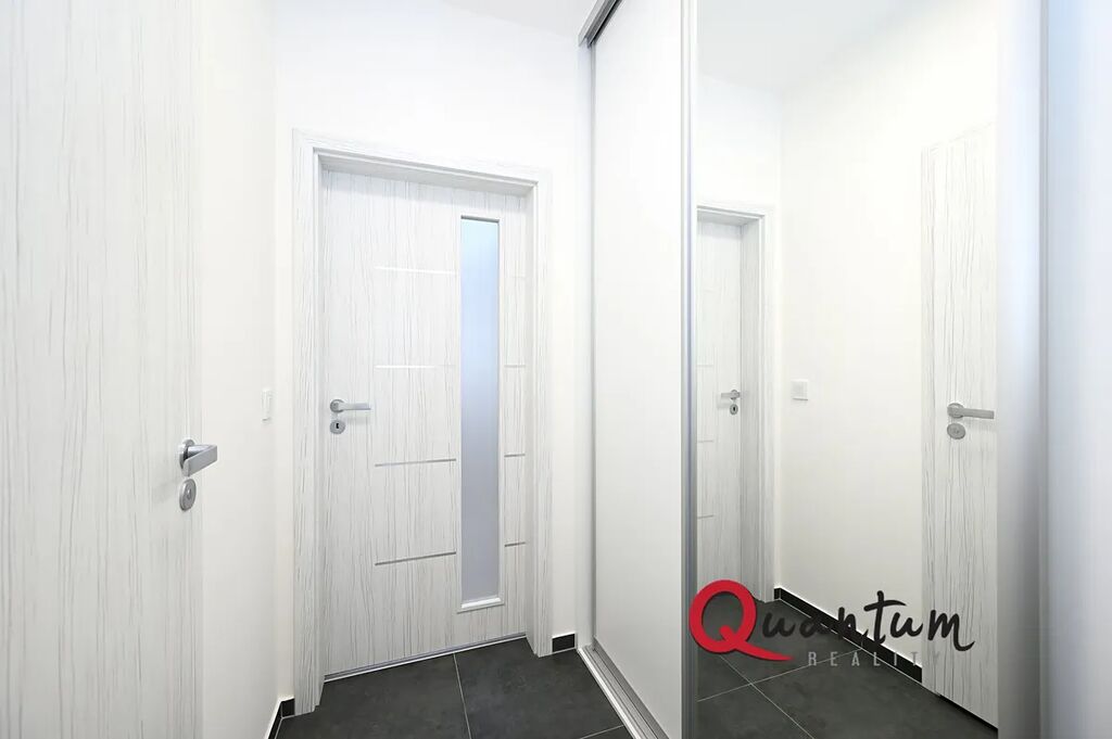 Byt se nabízí částečně zařízený. Je zde vstupní chodba s vestavěnou skříní. Dále kuchyň, která je vybavena novou kuchyňskou linkou s varnou indukční deskou a elektrickou troubou, mikrovlnnou troubou, lednicí, myčkou a jídelním stolkem se židlemi.