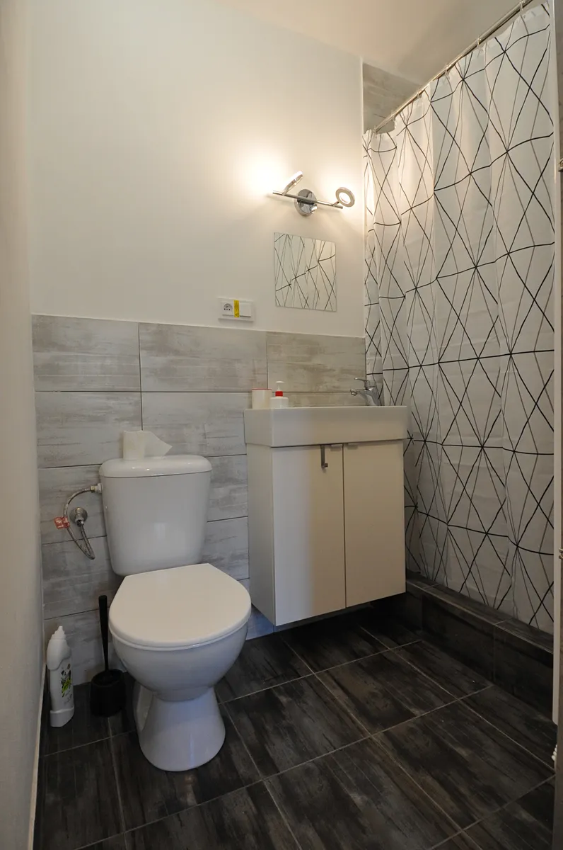 V přízemí domu se nachází 2 samostatné jednotky, každá cca 25 m2. Obě jednotky disponují kuchyňskou linkou (el. trouba, el. varná deska, dřez) a koupelnou se sprchou. Dále v přízemí najdeme technickou místnost a společnou chodbičku s pračkou a sušičkou.