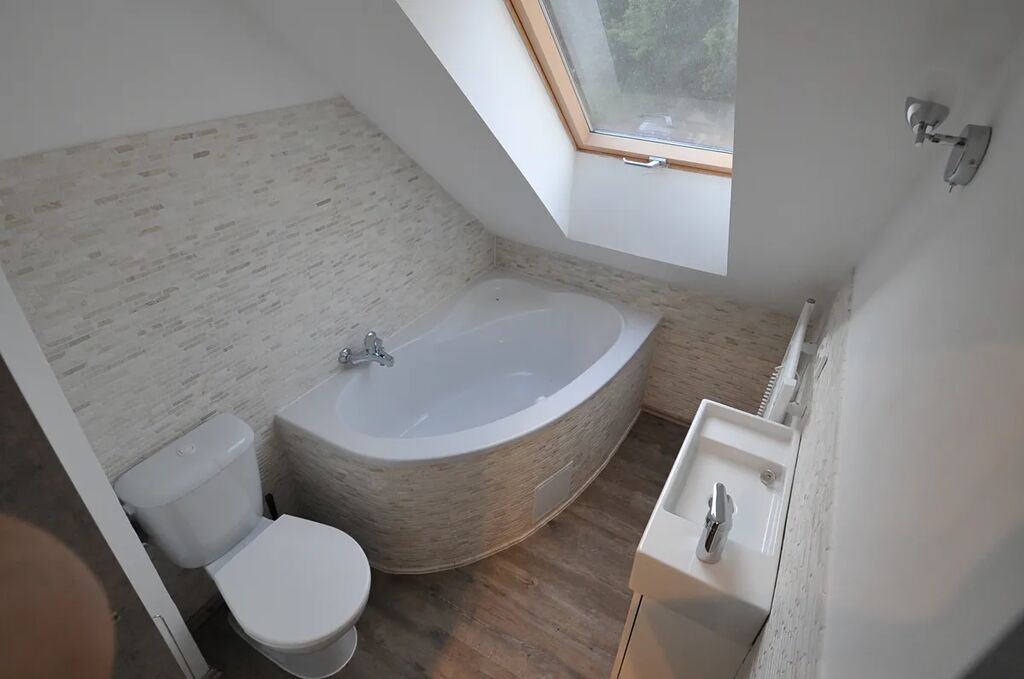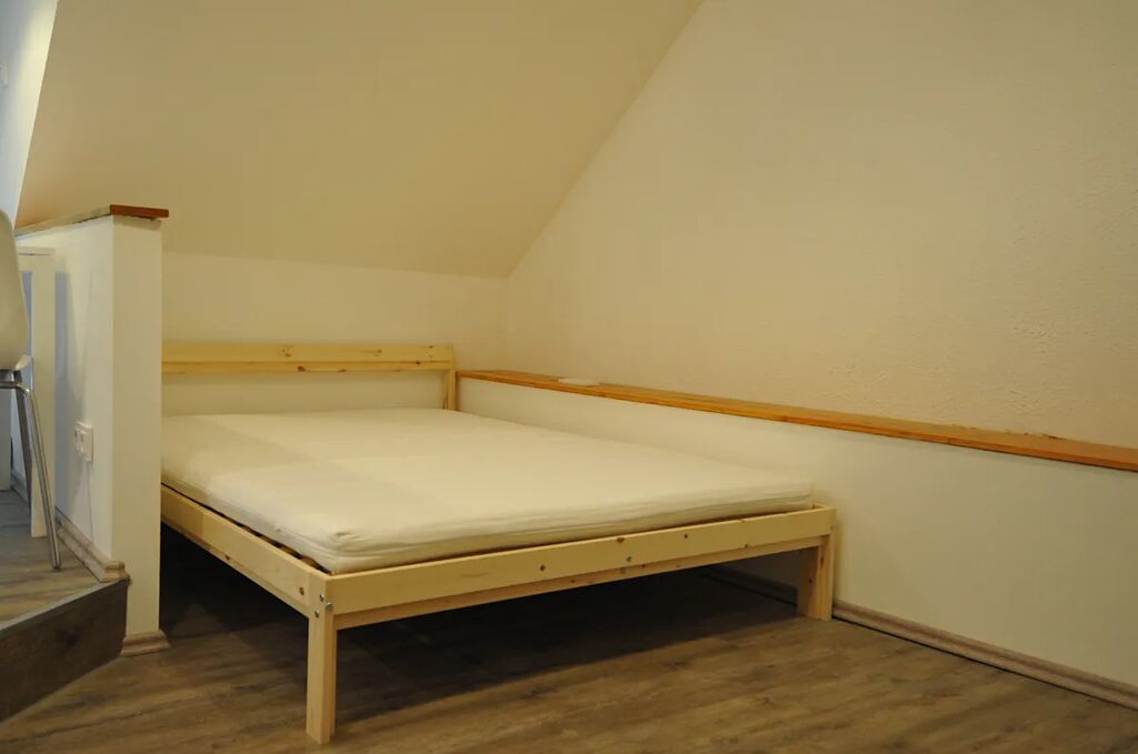 Podkroví je přístupné schody zvenku, které jsou společné pro zbývající 2 bytové jednotky. Také zde jsou jednotky vybaveny kuchyňskou linkou (el. trouba, el. varná deska, dřez) a koupelnami s vanou. Každá z jednotek má plochu cca 27 m2.