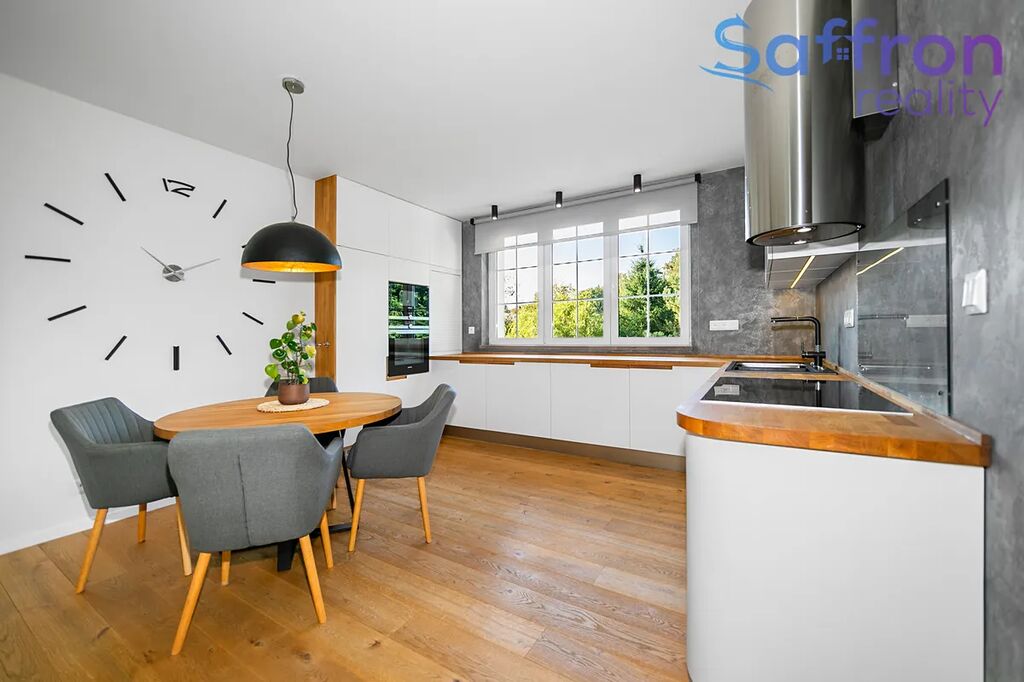 Při rekonstrukci byly použity kvalitní, nadčasové materiály. Interiér zdobí dřevěné podlahy a kuchyň je kompletně vybavena vestavnými spotřebiči, což ocení jak milovníci vaření, tak početnější domácnost. Teplo domova zajišťuje vlastní kondenzační kotel Vaillant, v koupelnách se o příjemný komfort stará podlahové vytápění a v letních dnech přijde vhod klimatizace.