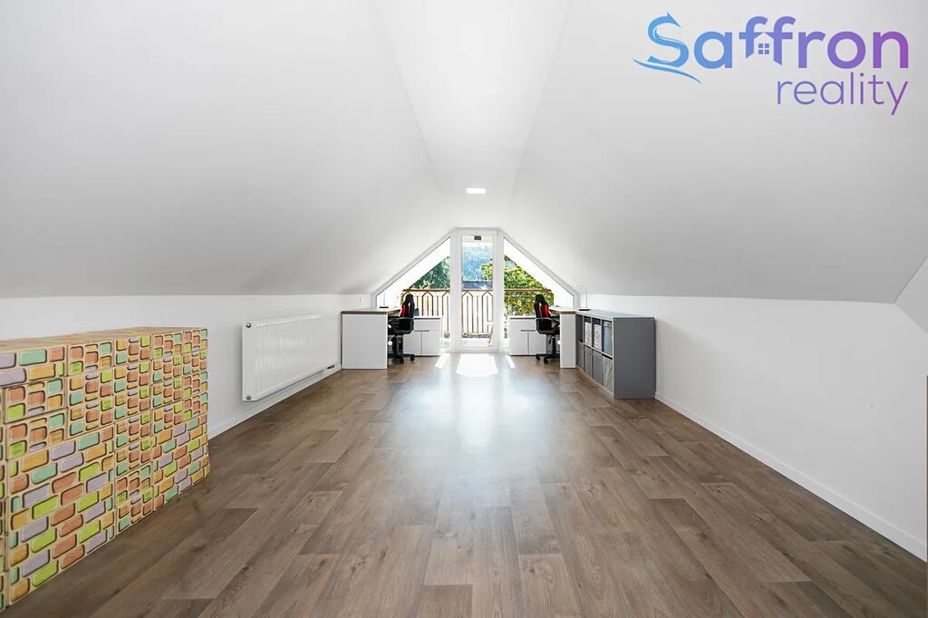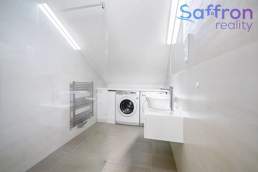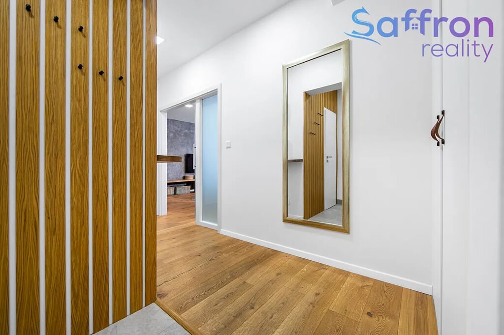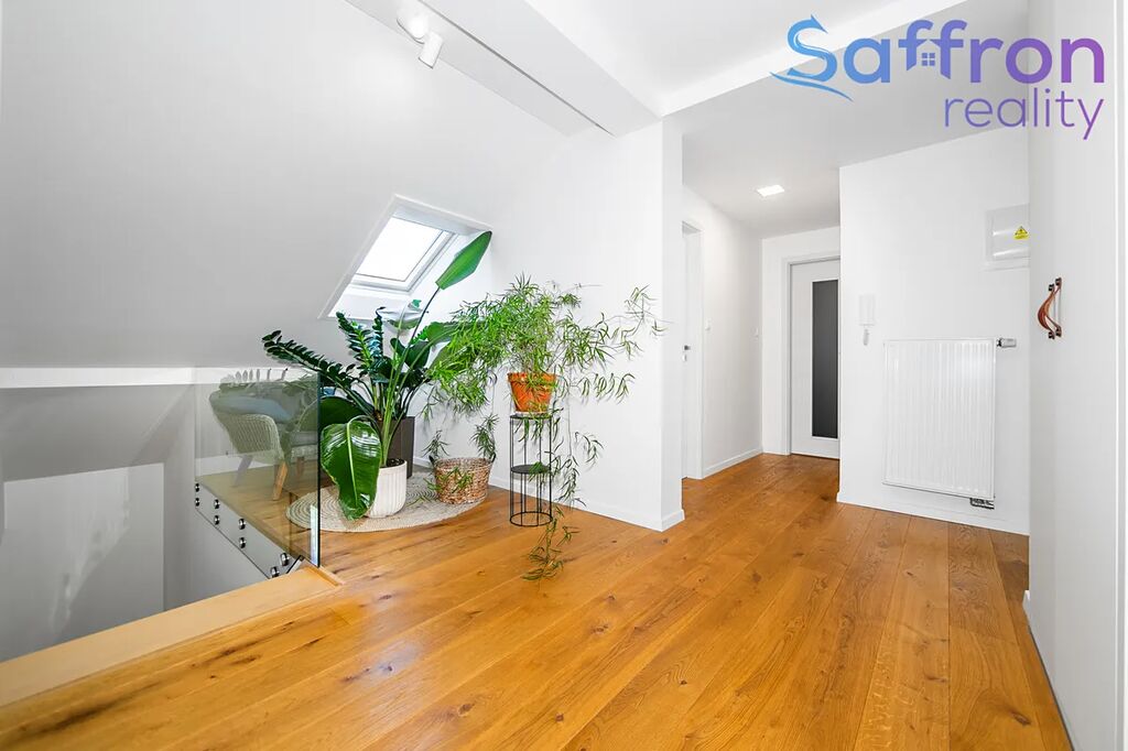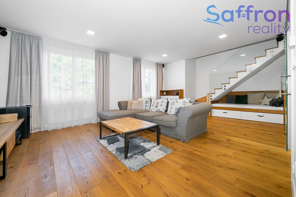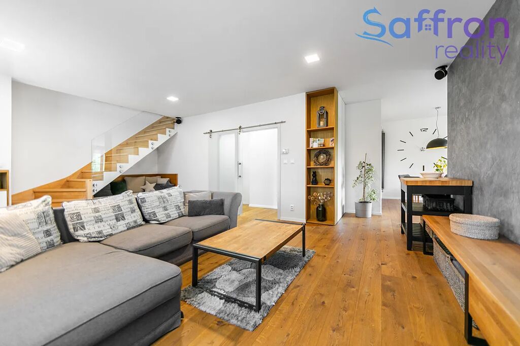 Byt prošel v roce 2017 kompletní rekonstrukcí. V prvním podlaží tvoří srdce domova velkorysý obývací prostor plynule propojený s kuchyní a jídelnou, díky čemuž se právě zde odehrává každodenní rodinný život. Ve druhém podlaží navazuje klidová zóna se čtyřmi samostatnými pokoji, které jsou nyní řešeny jako ložnice, dva dětské pokoje, z nichž jeden s přístupem na balkon a pokoj pro hosty s možností využití jako pracovna. V přízemí bytu je samostatná toaleta. V patře najdete další samostatné WC a dvě koupelny, jednu s vanou a druhou se sprchovým koutem, pračkou a sušičkou, nad nimiž je praktický odkládací pult. Praktické zázemí doplňuje bohatá škála úložných prostor včetně dvou komor a šatny.