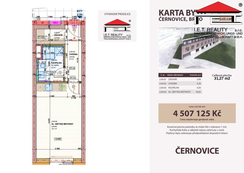 Nabízíme k prodeji nový byt s označením 2.04 o dispozici 1+kk v právě vznikajícím projektu Bytový dům Faměrovo náměstí v Brně. Byt o celkové výměře 31,27 m² se nachází v moderní novostavbě s důrazem na kvalitní provedení, funkční dispozice a moderní městské bydlení. K bytu dále náleží jedno parkovací místo v 1.NP tohoto bytového domu za cenu 583.245,- Kč, které není zahrnuto v kupní ceně. Po dohodě lze zakoupit i více parkovacích míst.