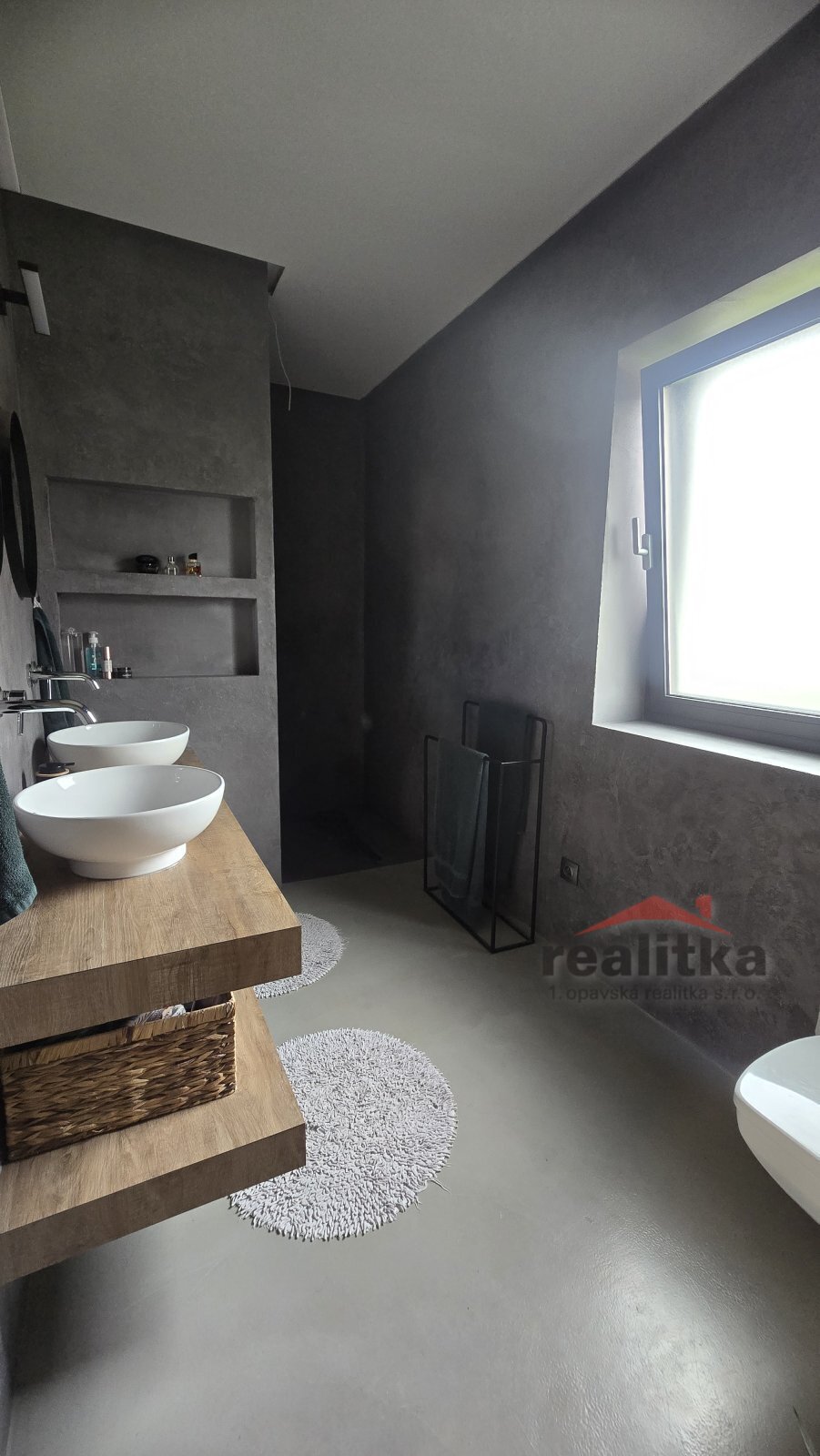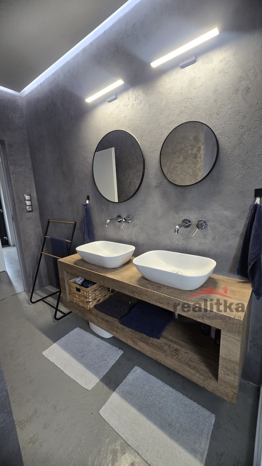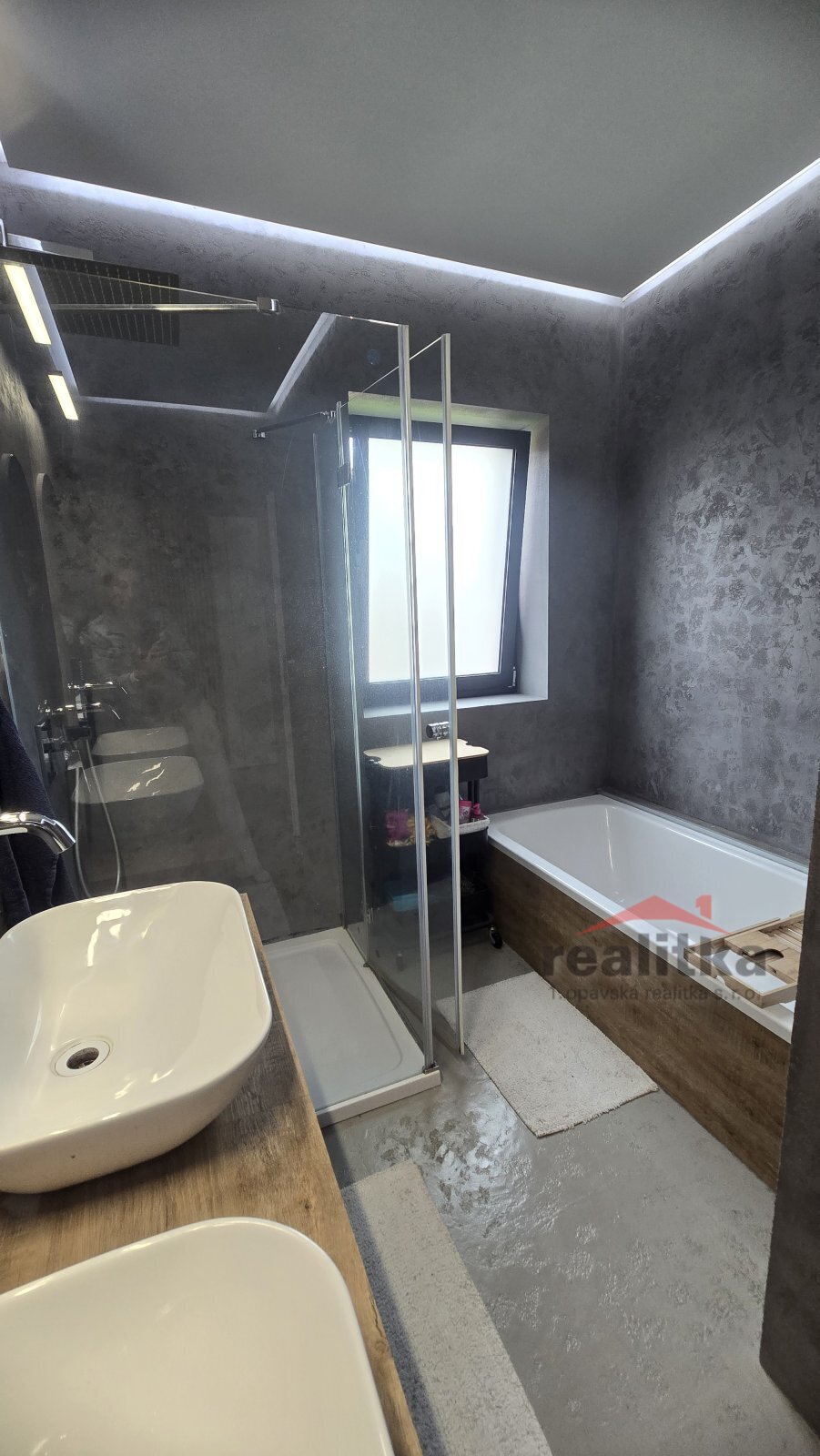 Interiér domu má moderní, kvalitní prvky. V celém domě je liniové zabudované osvětlení, bezobložkové interiérové dveře do všech místností, vinylová bezprahová podlaha, podlahové topení ve všech prostorech domu, betonové designové stěrky, hliníkové okna včetně žaluzií na dálkové ovládání, 2x posuvné terasové dveře - HS portál. Všechny pokoje v domě jsou samostatné se vstupem z předsíně. Ve všech pokojích je pevný internet. Ložnice má vstup do šatny a koupelny, kde jsou 2 umyvadla, wc a sprchový kout. Další koupelna je vedle 2 dětských pokojů, jsou zde opět 2 umyvadla, vana, sprchový kout, další wc je samostatně. Obývací pokoj je spojený kuchyňskou částí a jídelnou se vstupem na velkou terasu s posezením. V obývací části je vše připraveno na zabudování krbu se zkolaudovaným komínem. V prostorné kuchyni je zabudovaná lednice, mrazák, myčka, trouba, mikrovlnka, digestoř a velká indukce a je zde také velká potravinová komora. Obývací pokoj je situovaný na JV stranu, dětské pokoje jsou na stranu severní a ložnice na stranu JZ. Ve vstupní chodbě jsou zabudované skříně a odkládací stěna. Dům je postaven z itongu 37, zateplen 10cm polystyrenem, střecha je Satian - zateplený plech a 50cm izolace. Vytápění domu je tepelným čerpadlem včetně ohřevu vody. V domě je také technická místnost, kde se nachází záložný elektro zdroj, 300l hydrobox, napojení na pračku a sušičku.