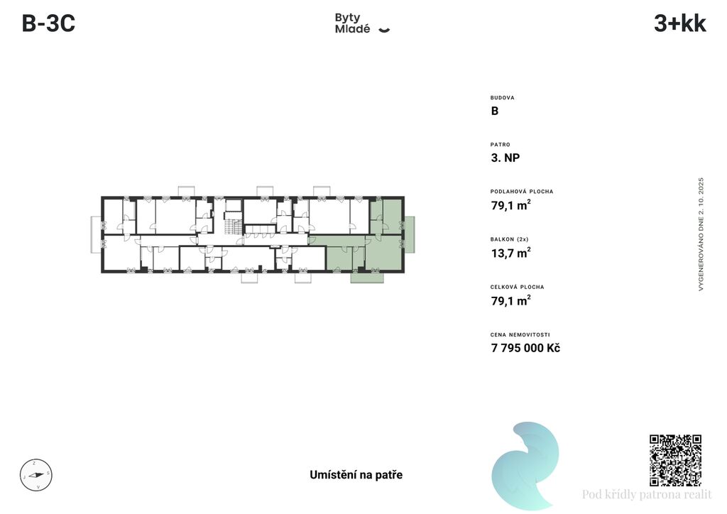 Nabízený byt č. B-3C o dispozici 3+kk, výměře 79,1 m2 a dvěma balkony 7,2 m2 a 6,5 m2, se nachází ve druhém patře budovy B. Disponuje vstupní chodbou, koupelnou, obývacím pokojem s kuchyňským koutem, dvěma neprůchozími pokoji, samostatnou toaletou a šatnou.