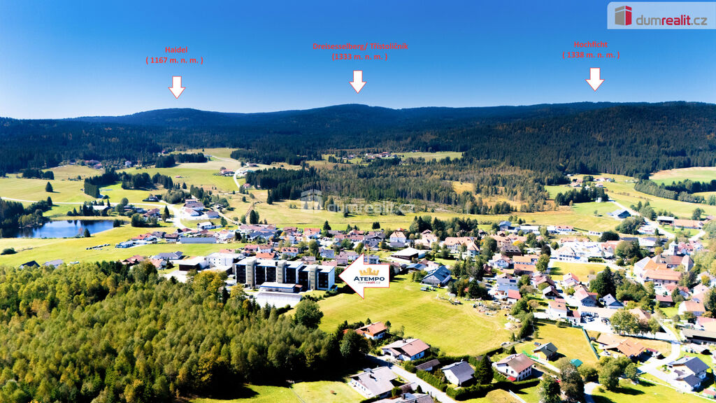 Dumrealit.cz Vám zprostředkuje exkluzivní prodej světlého bytu 2+1 se 2 lodžiemi, v osobním vlastnictví, v apartmánovém bytovém domě s výtahem, který se nachází jen pár kilometrů od českoněmeckých hranic v obci Haidmühle, na adrese Adalbert Stifter Strasse 95. Dispozice bytové jednotky, která se nachází ve 3. patře (4.NP), naleznete na orientačním plánku mezi fotografiemi. K apartmánu náleží dvě lodžie: 1) z ložnice na východní světová stranu; 2) z obývacího pokoj s krásným výhledem na západní světovou stranu. Byt se prodává s vybavením (viz. fotografie). Bytový dům prochází revitalizací, nově namontována plastová okna, rekonstrukce fasády se zateplením, solární systém, apod.. V apartmánovém domě je k využití společná herna s dětským koutkem a společná lyžárna (kolárna). Parkování je zdarma přímo před objektem.