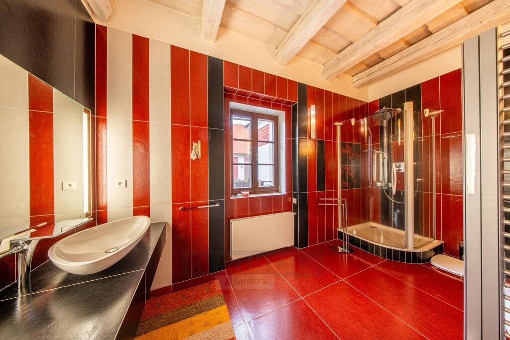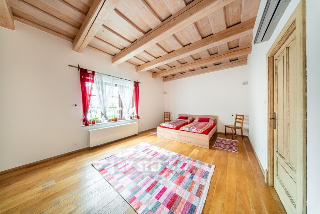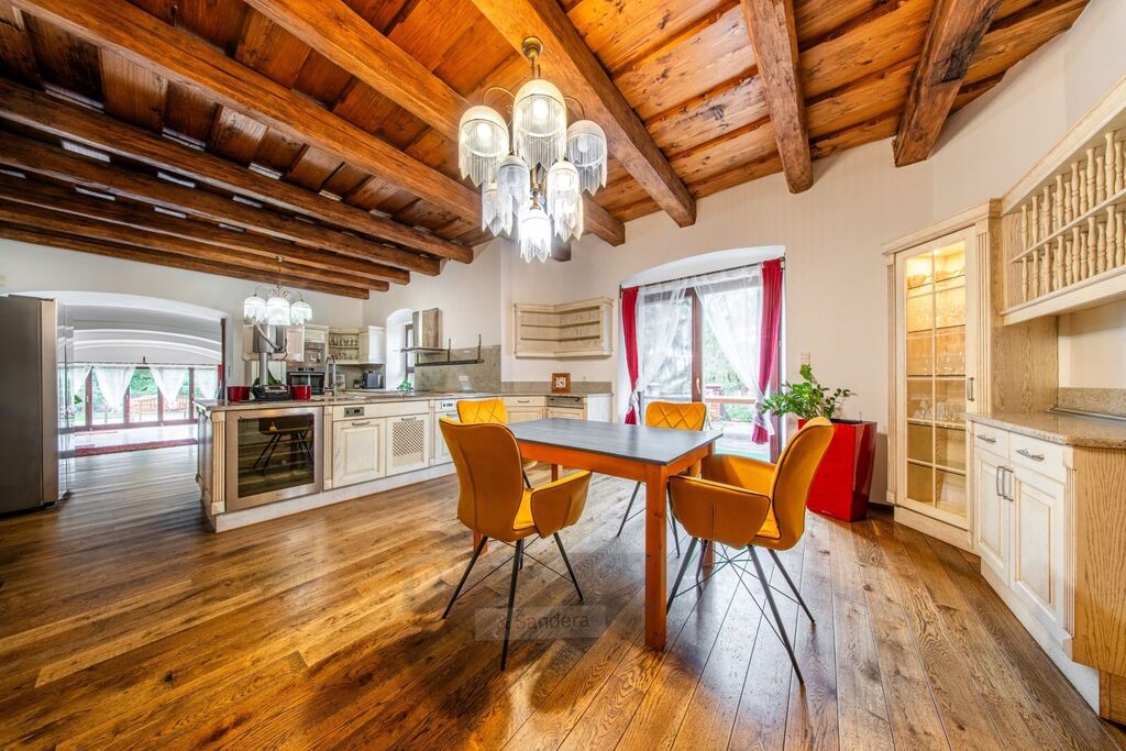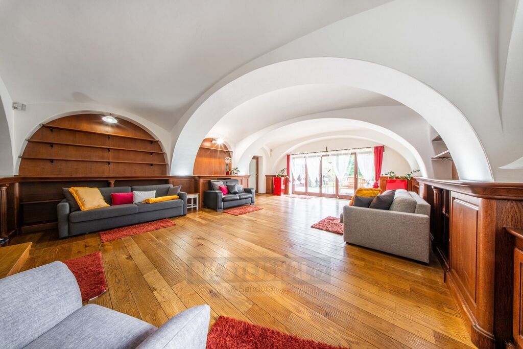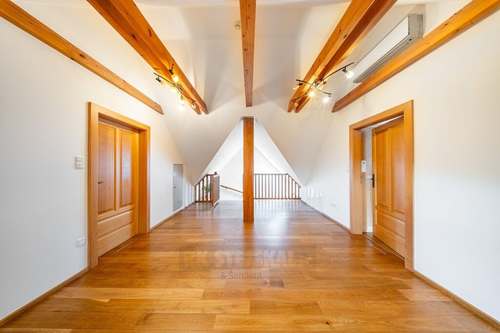 Hlavní stavba - rozlehlá rezidence do U s vnitřním nádvořím, garáže, hostinský byt, technická místnost, kancelář, archiv, serverovna, sociál a kuch. zázemí pro kancelář, bazénová místnost, wellness se saunou a kompletním zázemím, průchozí do RD přízemní části hlavní stavby, kde je obývací pokoj, kuchyňská místnost s jídelním prostorem, prosklení a vstupy do zahrady a na terasy, šatna, koupelna, komory a WC, ložnice, prostorné zádveří pro hlavní vstup do RD části z nádvoří, vstup do suterénu, hala se schodištěm do patra, v patře vstupní místnost vhodná jako průchozí obývací pokoj, zrcadlově pak dvakrát šatna s koupelnou, samostatná WC a prostorné ložnice, v suterénu domu pak dvě vinotéky a hodovna, dále pak sklepní místnost a samostatné WC,