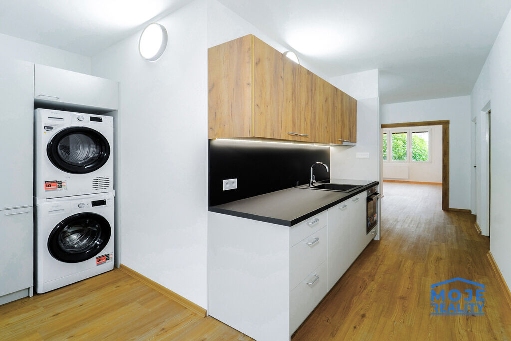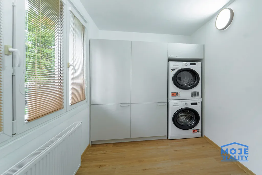 oddělený praktický kout s pračkou, sušičkou, vestavěnou lednicí s mrazákem a velkými úložnými prostory