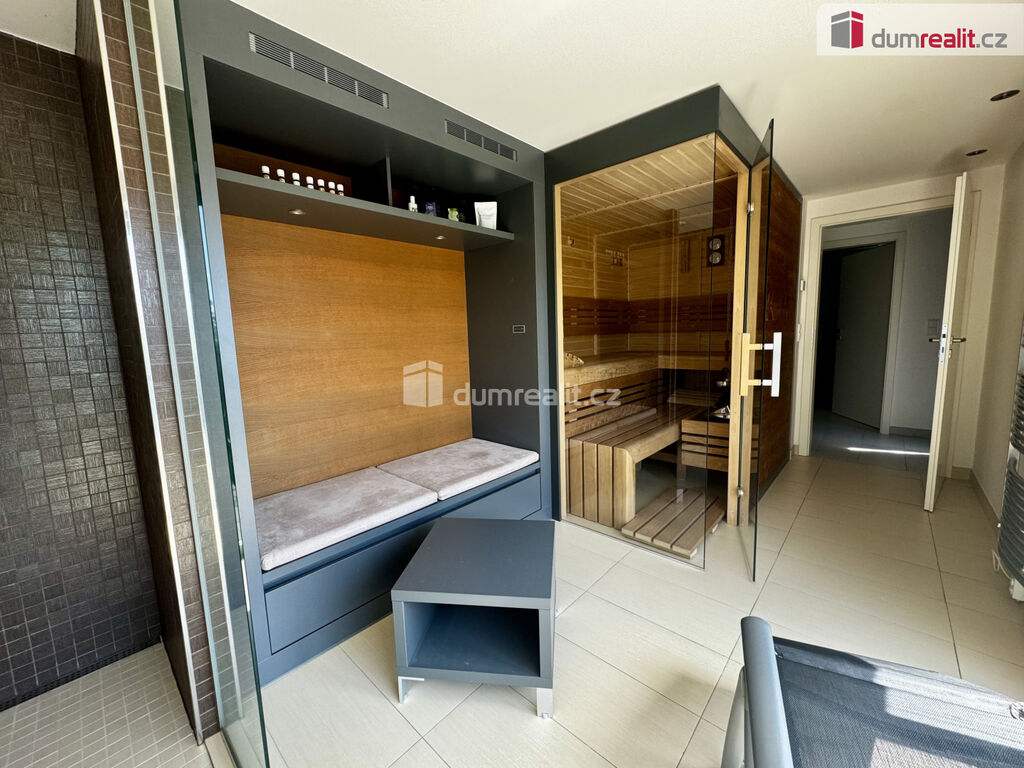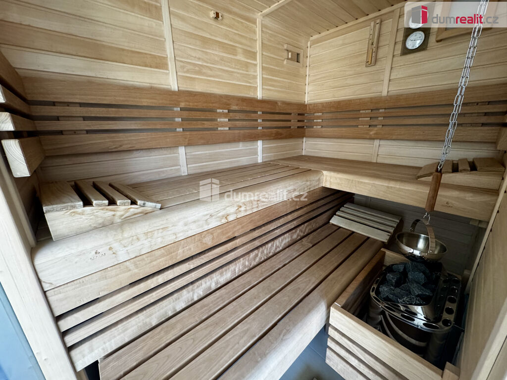 Suterén (45 m²): tělocvična, technická místnost, sauna s odpočinkovým prostorem a sprchou
