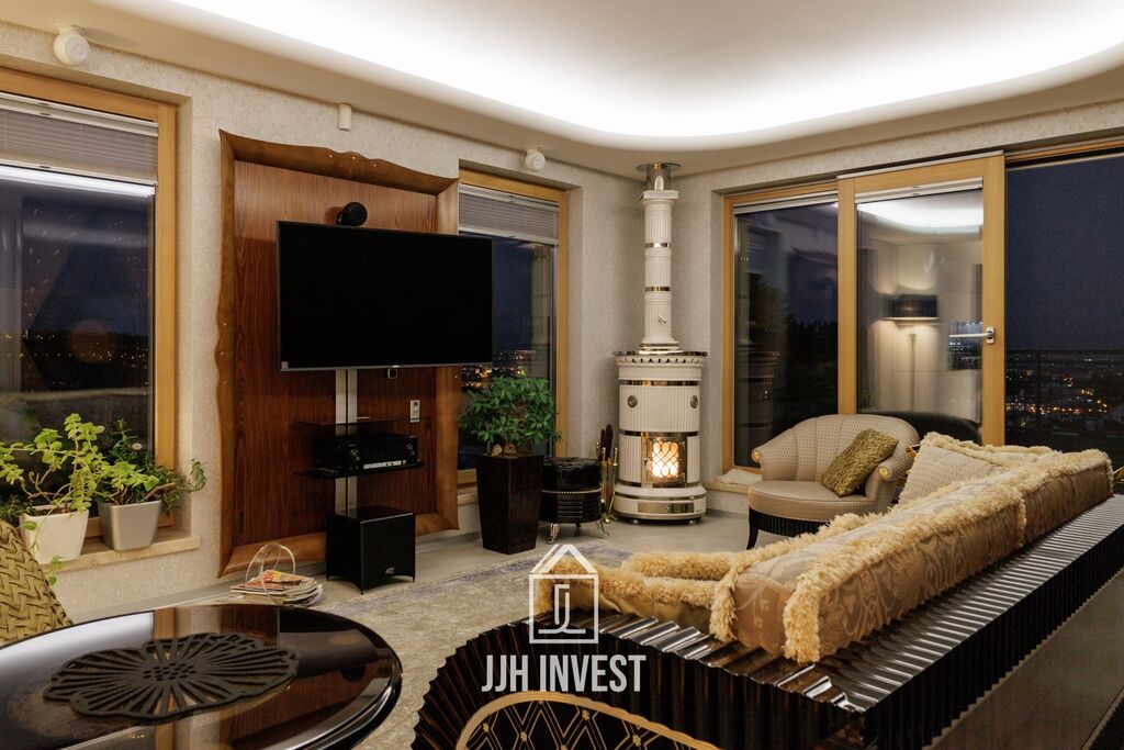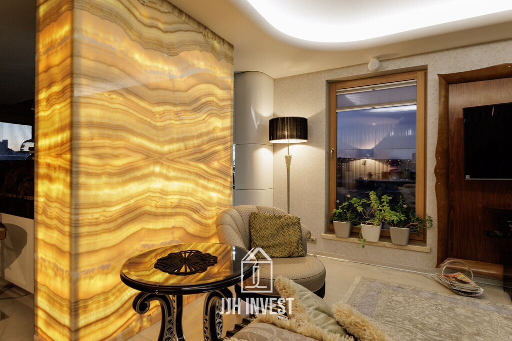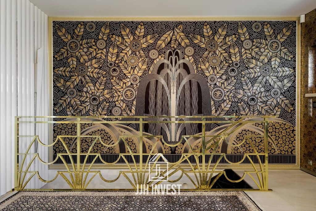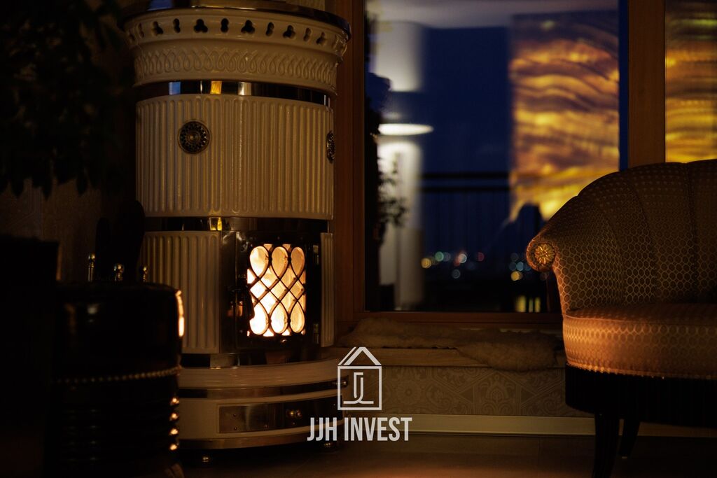 Interiér? Nadčasové Art Deco, laděné do posledního detailu. Designové značky jako Carpanelli, světla Fendi, postel Hästens, podsvícený onyx v obývacím pokoji nebo schodiště z masivního mramoru – každý prvek má svou kvalitu i příběh. Podlahové vytápění po celém bytě doplňují stylová krbová kamna pro atmosféru.