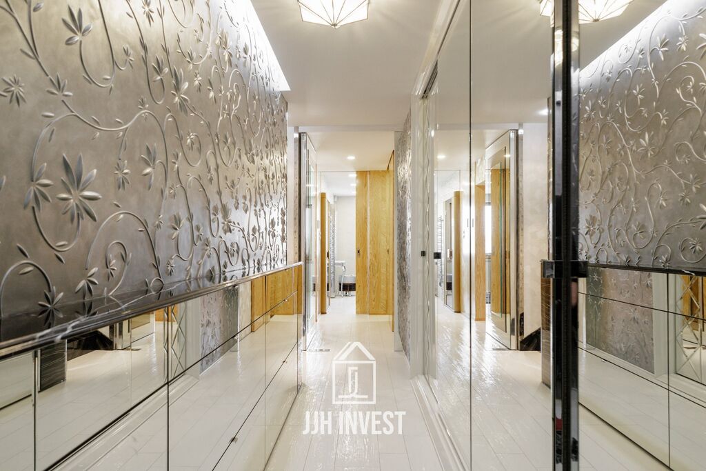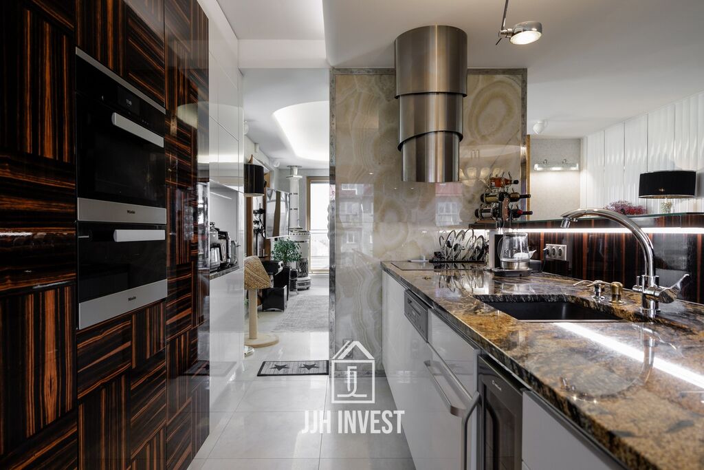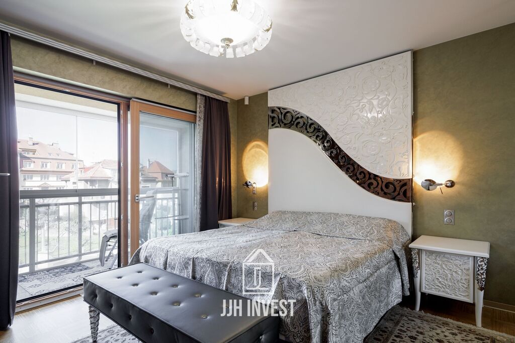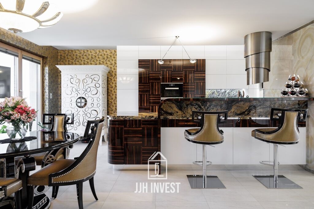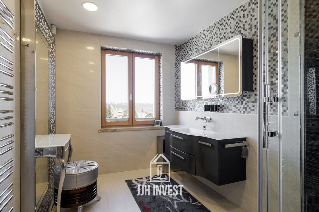 Interiér? Nadčasové Art Deco, laděné do posledního detailu. Designové značky jako Carpanelli, světla Fendi, postel Hästens, podsvícený onyx v obývacím pokoji nebo schodiště z masivního mramoru – každý prvek má svou kvalitu i příběh. Podlahové vytápění po celém bytě doplňují stylová krbová kamna pro atmosféru.