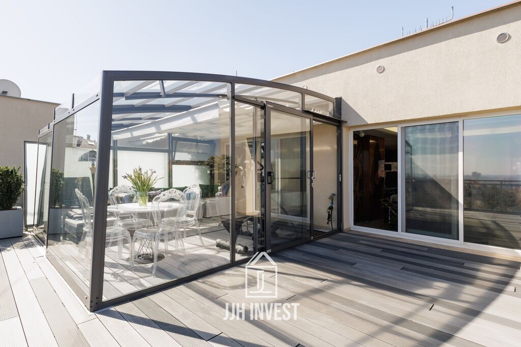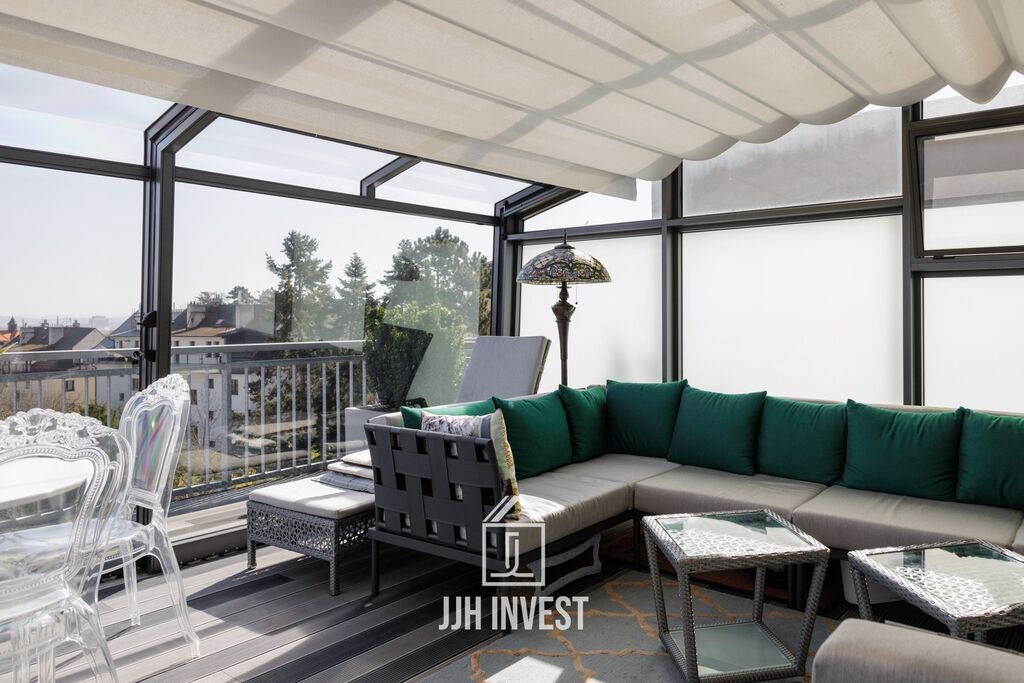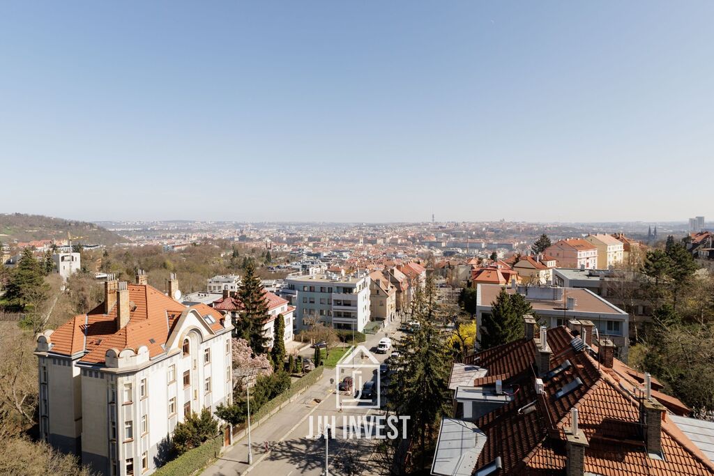 Z bytu ve 2 podlažích (6. a 7. patro) vystoupíte přímo na soukromou terasu 48 m2, která vám otevře Prahu jako na dlani – od Strahova až po Pankrác. Další balkon u ložnice (4 m2) je ideálním místem pro ranní kávu nebo večerní klid.