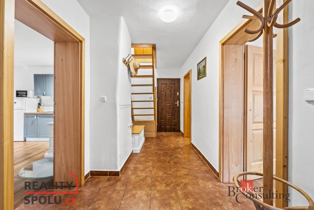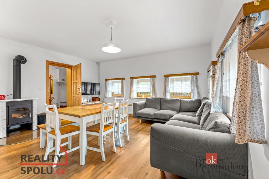 Chalupa o celkové ploše cca 96 m² prošla rozsáhlou rekonstrukcí a je plně připravena k užívání, zůstává totiž kompletně vybavena. V přízemí se nachází obývací pokoj spojený s jídelnou a kuchyňským koutem. Kachlová kamna dodávají prostoru útulnou atmosféru, nechybí pohodlná sedací souprava ani televize. Kuchyně je vybavena moderními spotřebiči včetně myčky, indukční desky, trouby a kávovaru. V přízemí se dále nachází ložnice a sociální zázemí. V prvním patře je pak velká ložnice s dvěma manželskými postelemi. Dispozice nabízí dostatek prostoru jak pro rodinné využití, tak pro ubytování hostů.