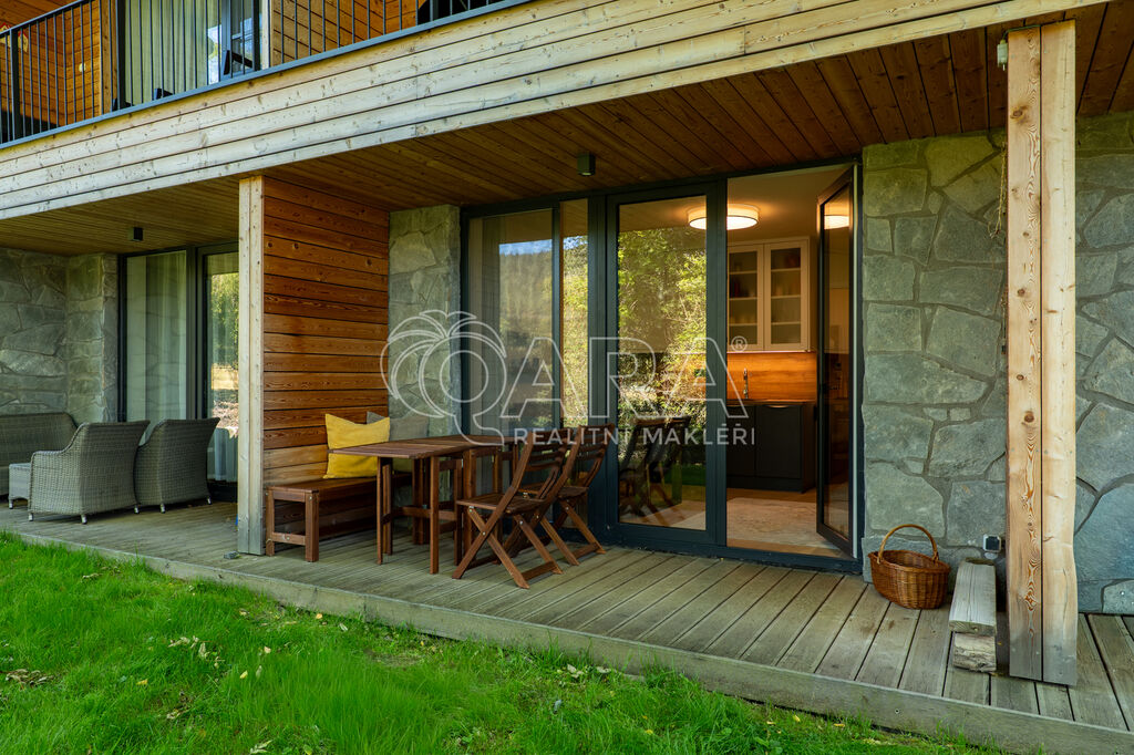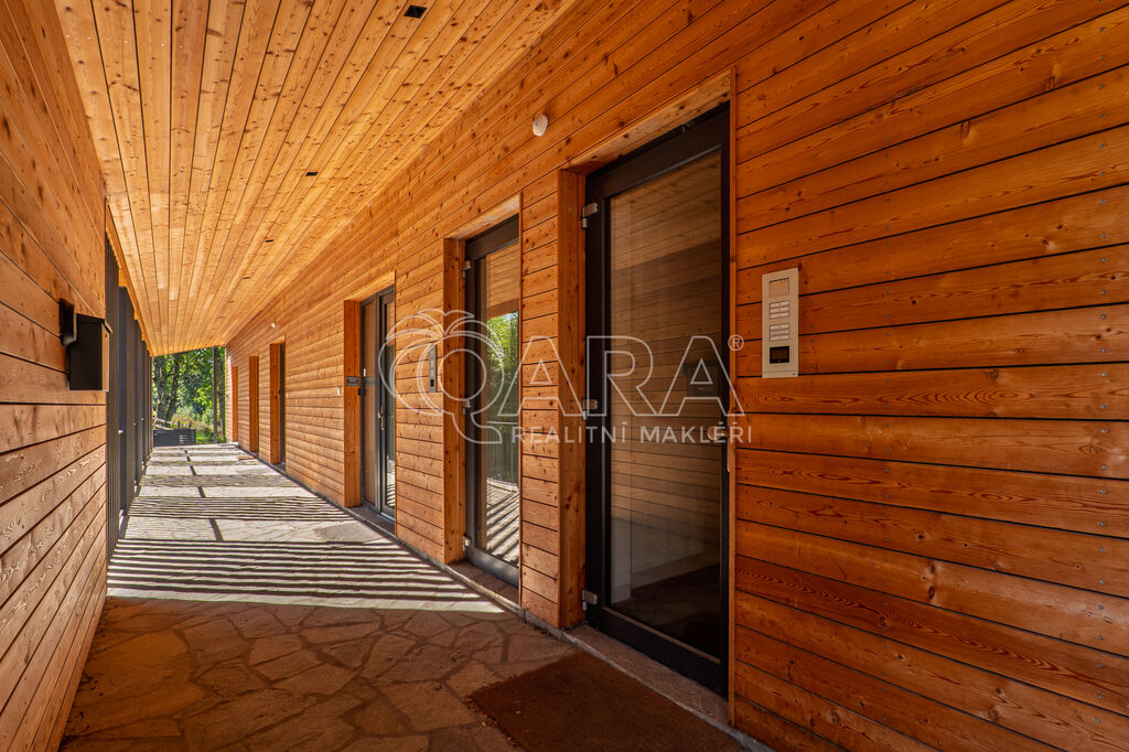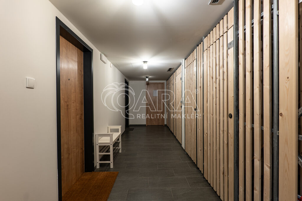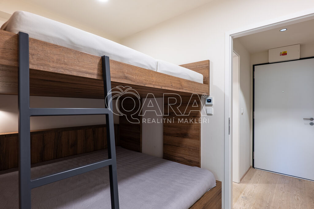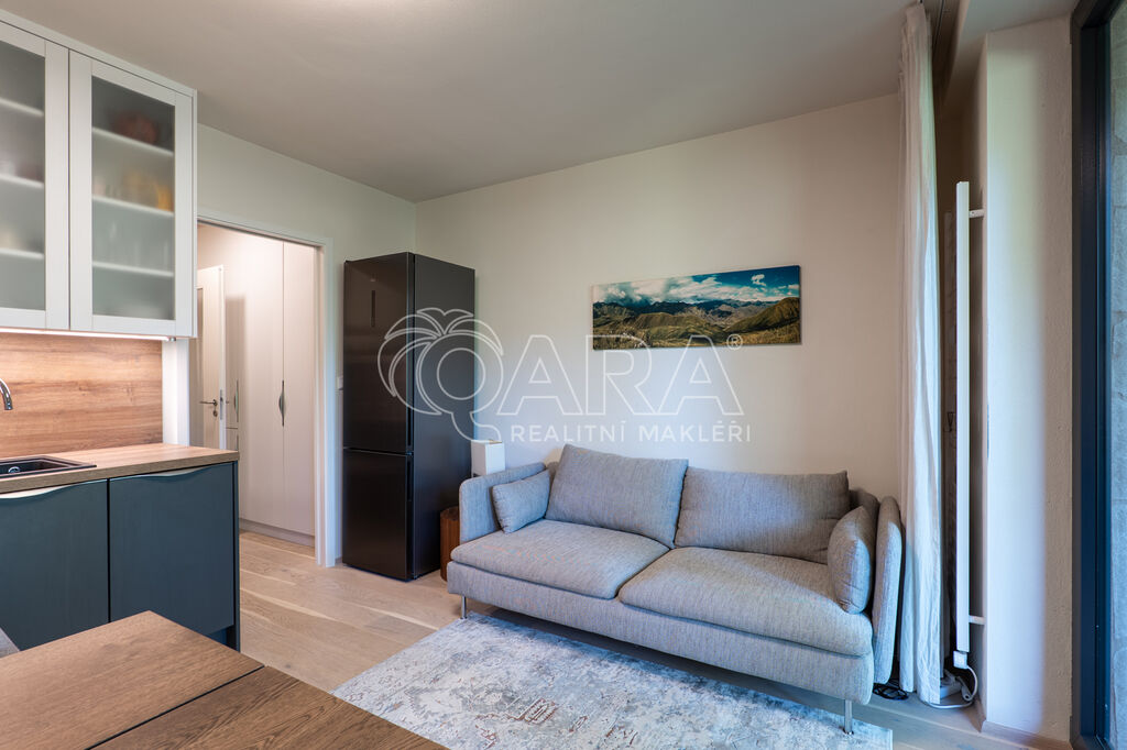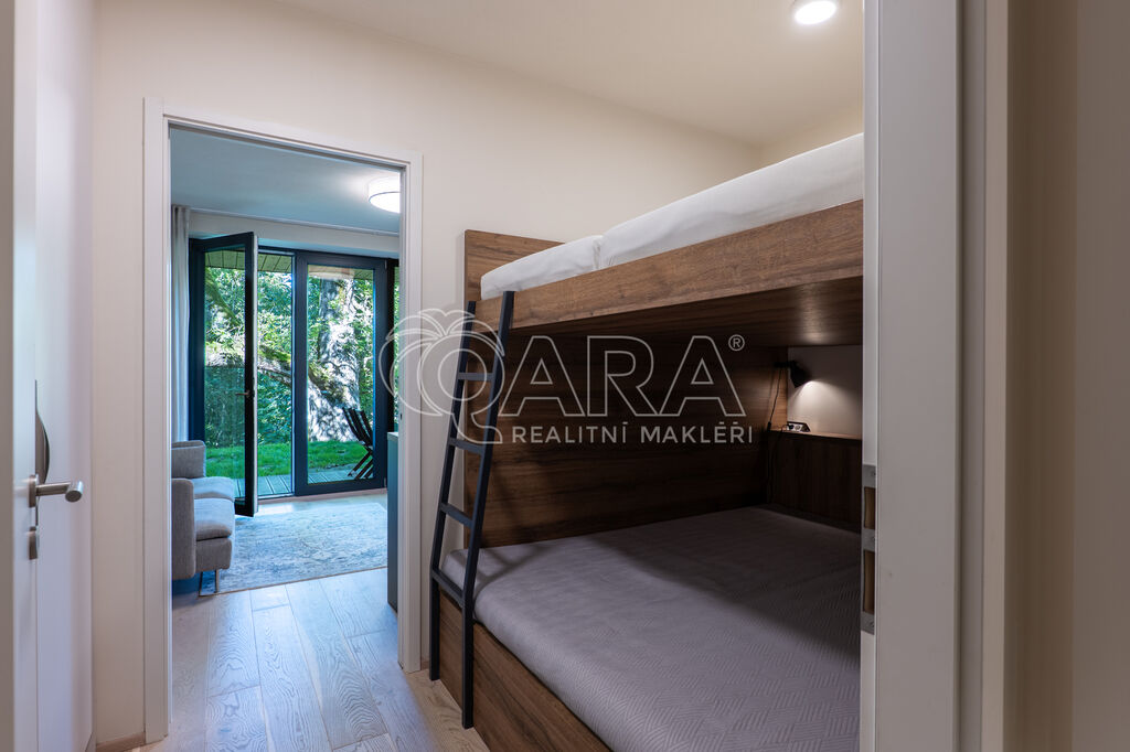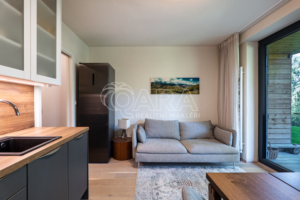 Byt je orientován na severozápad a nabízí jedinečné výhledy do okolní přírody. Interiér je zařízen na míru ve vysokém standardu, kuchyňské spotřebiče značky AEG, podlaha z masivu. Dispozice zahrnuje vstupní chodbu s vestavěnou skříní, obývací pokoj s kuchyňským koutem a vstupem na terasu, patrovou manželskou postel umístěnou v klidové zóně, koupelnu se sprchovým koutem a toaletou. Úložné prostory jsou řešeny prakticky a s maximálním využitím místa. K bytu náleží prostorný sklep přímo naproti vstupu do jednotky a venkovní parkovací stání.