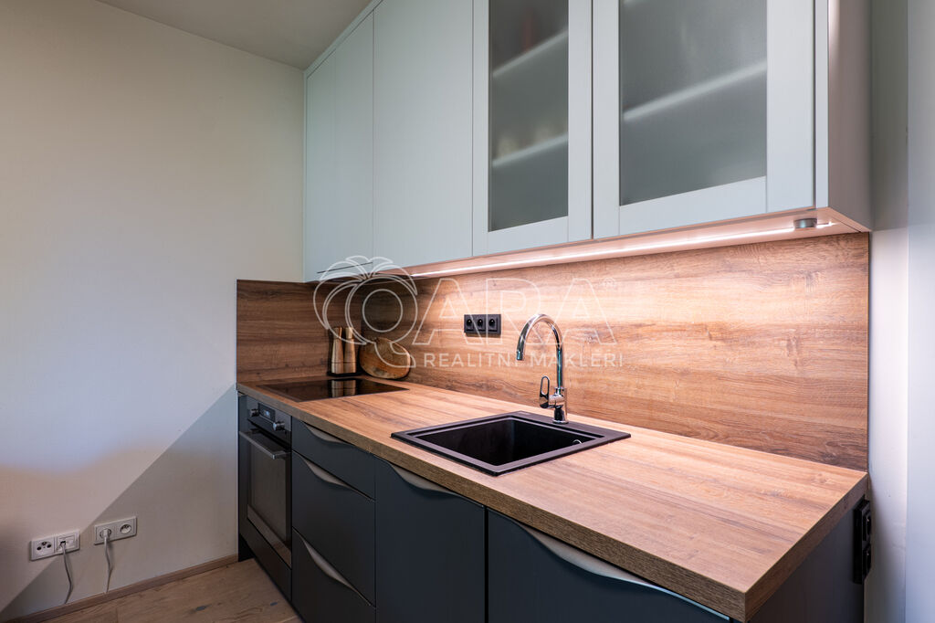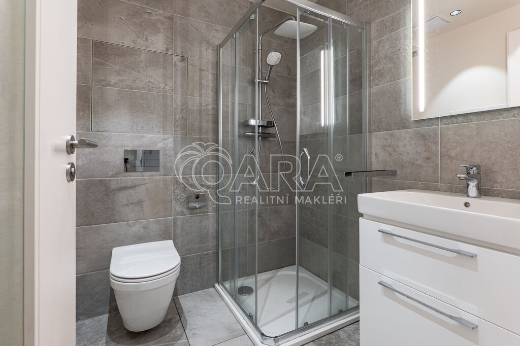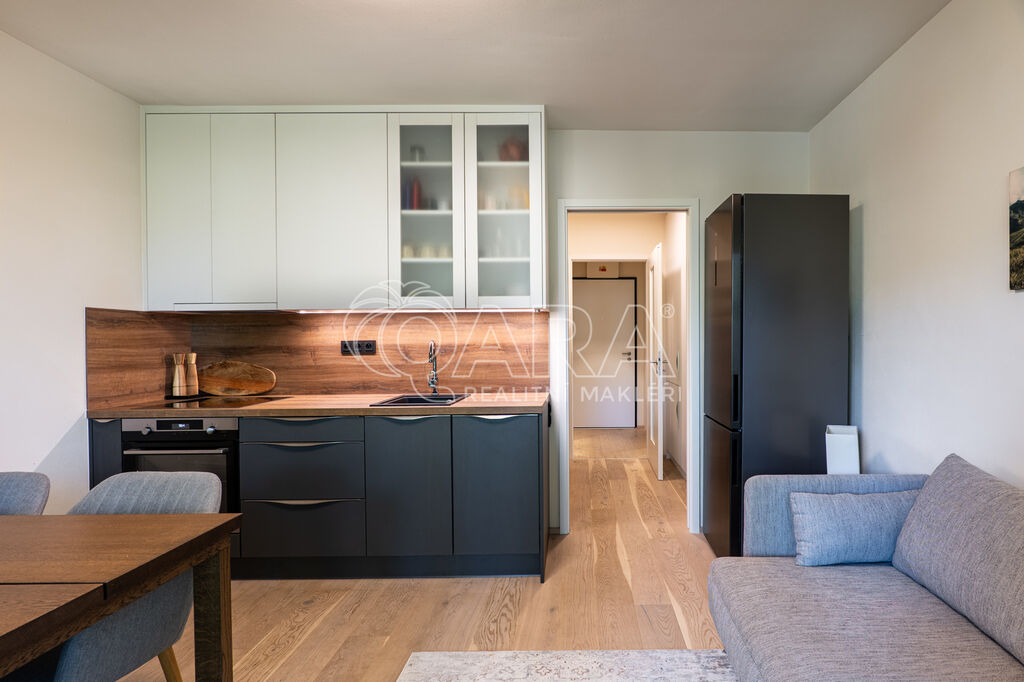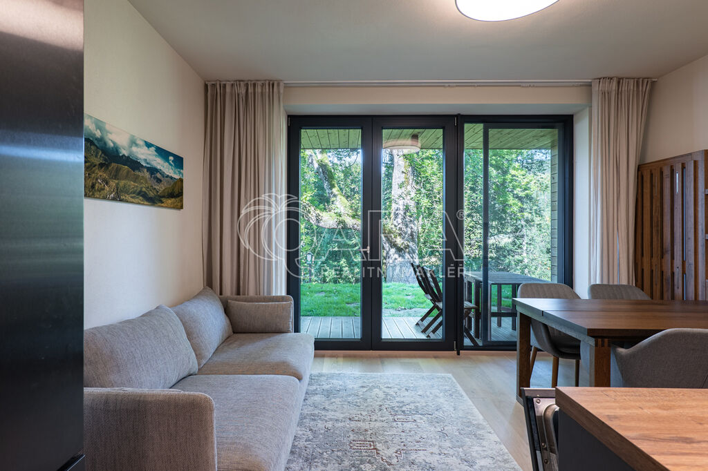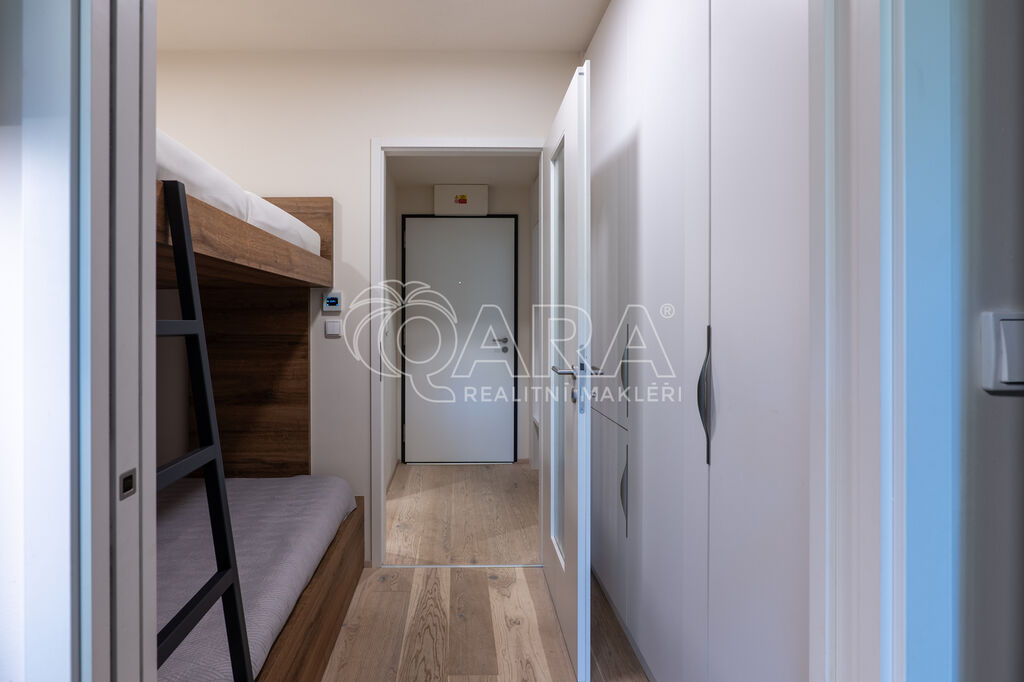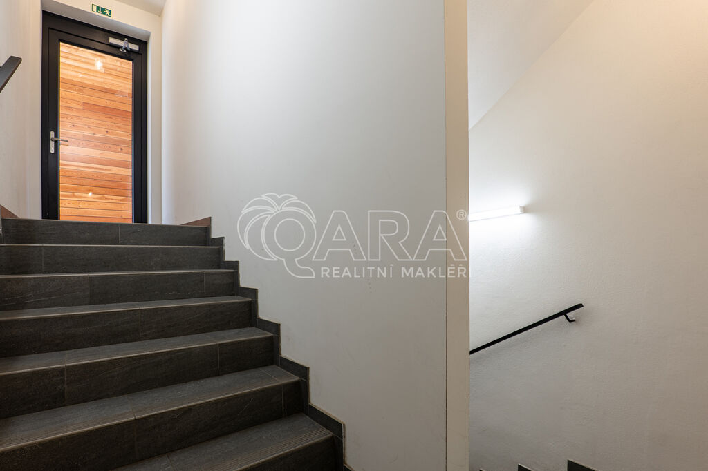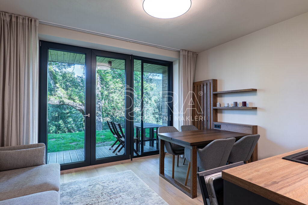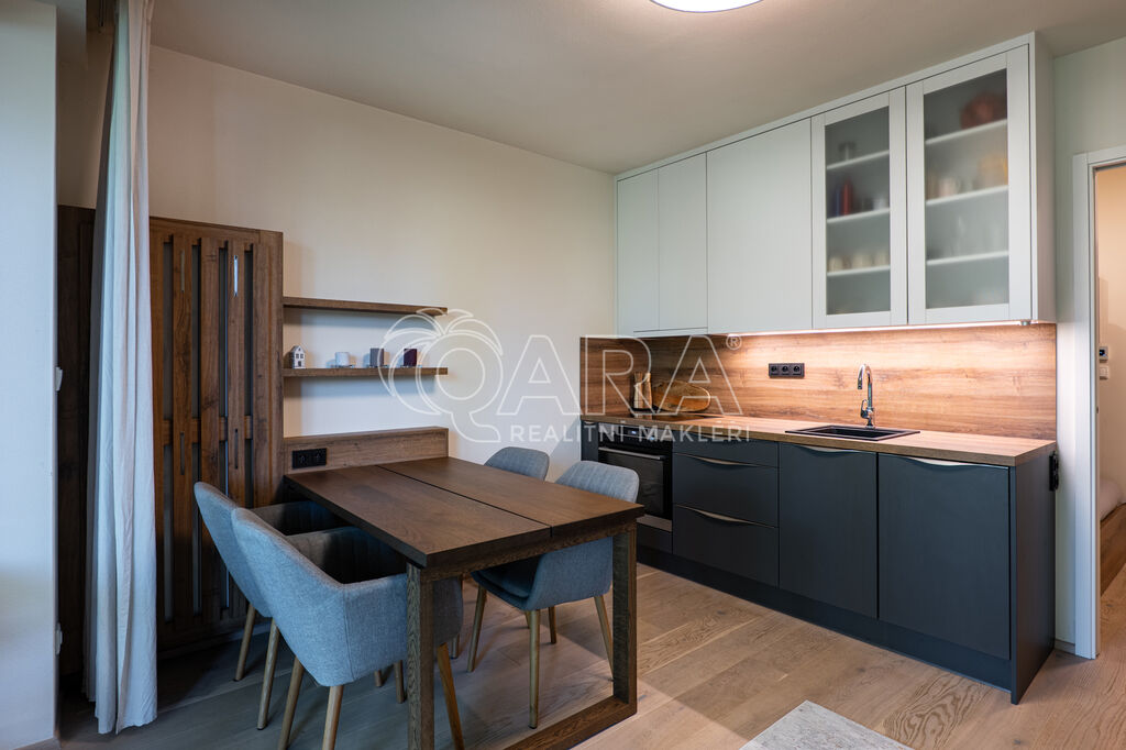 Byt je orientován na severozápad a nabízí jedinečné výhledy do okolní přírody. Interiér je zařízen na míru ve vysokém standardu, kuchyňské spotřebiče značky AEG, podlaha z masivu. Dispozice zahrnuje vstupní chodbu s vestavěnou skříní, obývací pokoj s kuchyňským koutem a vstupem na terasu, patrovou manželskou postel umístěnou v klidové zóně, koupelnu se sprchovým koutem a toaletou. Úložné prostory jsou řešeny prakticky a s maximálním využitím místa. K bytu náleží prostorný sklep přímo naproti vstupu do jednotky a venkovní parkovací stání.
