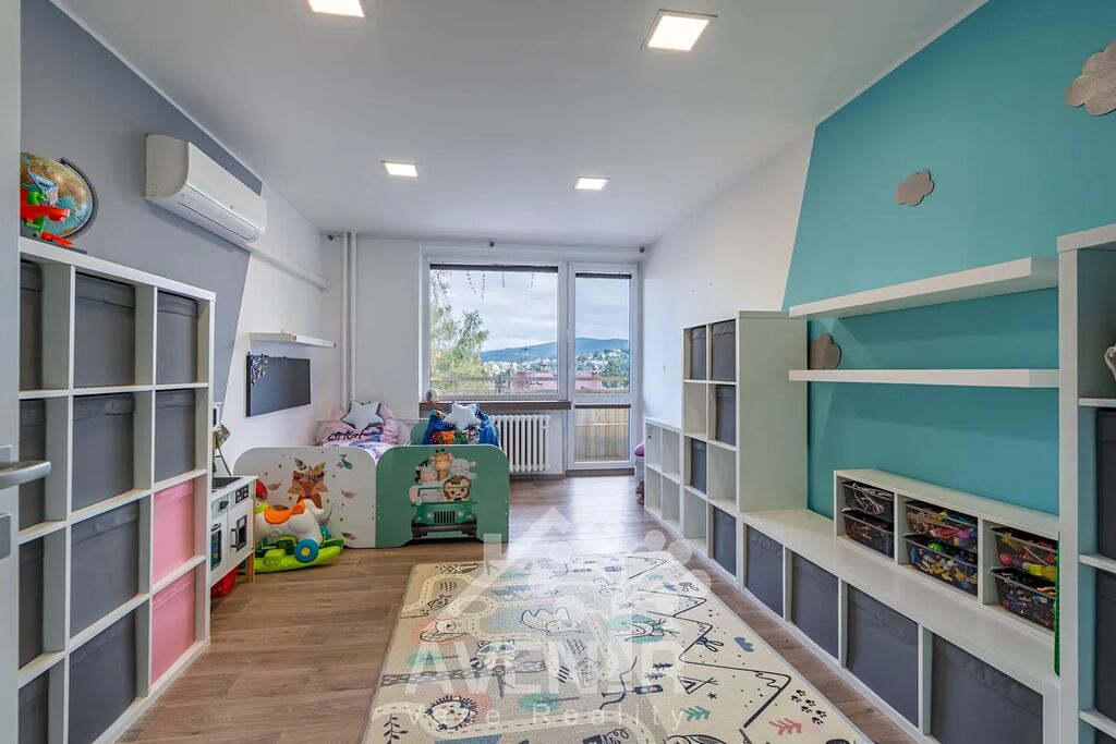 Velkoryse řešená dispozice nabízí dostatek prostoru pro celou rodinu i domácí kancelář. Balkon je orientovaný s výhledem na celé město, je osvětlený a vybaven elektrickou zásuvkou – ideální pro večerní posezení. Balkón je veden přes dva pokoje
