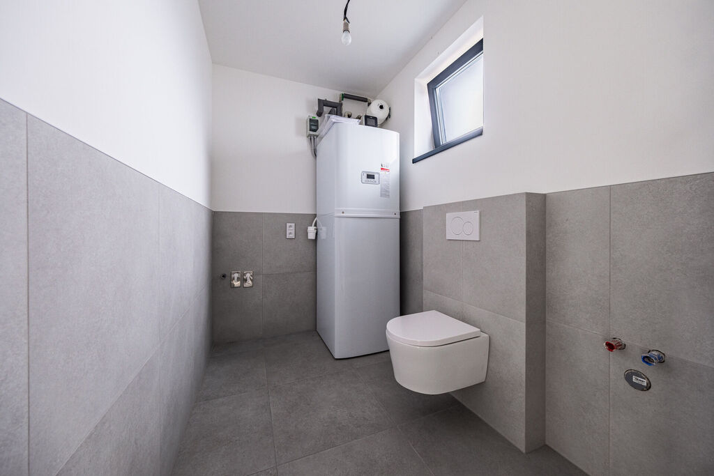 Dále v přízemí najdete technickou místnost s místem pro pračku a sušičku, toaletu, komoru pod schody a samozřejmě vstupní zádveří.