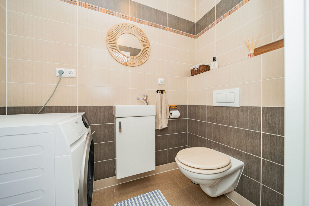 Obývací pokoj v přízemí domu s přímým vstupem na terasu a dále do zahrady, je moderně propojený s kuchyní. Ta je vybavena kuchyňskou linkou na míru se spotřebiči a je zde praktická úložná komora. V přízemí bytu je také vstupní chodba a toaleta. V patře domu jsou dva pokoje, krásná ložnice a druhý pokoj, který je v současné době rozdělen na dva, dětský pokoj a pracovnu. Koupelna je s vanou a toaletou, nechybí připojení na pračku. Topení je řešené elektrickým kotlem. Okna jsou plastová se žaluziemi. Velkou výhodou bytu je klidné bydlení, již zmiňovaná krásná, rovinatá zahrada a skvělá dostupnost Prahy či blízkých Hostivic. Parkování je pohodlné před domem.