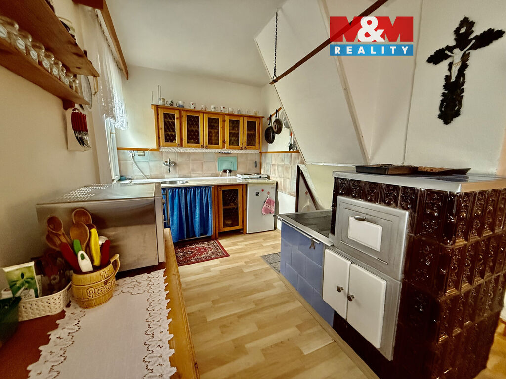 Na ploše cca 52 m² najdete vše, co k pohodovému pobytu potřebujete. V přízemí vás přivítá světlý obývací pokoj propojený s kuchyní a jídelnou, jehož dominantou jsou kachlová kamna. Ta nejen krásně hřejí, ale umožní vám také uvařit si oběd či upéct domácí chléb – atmosféra, kterou v moderním bydlení jen tak nenajdete. Přízemí doplňuje koupelna se sprchovým koutem a WC.