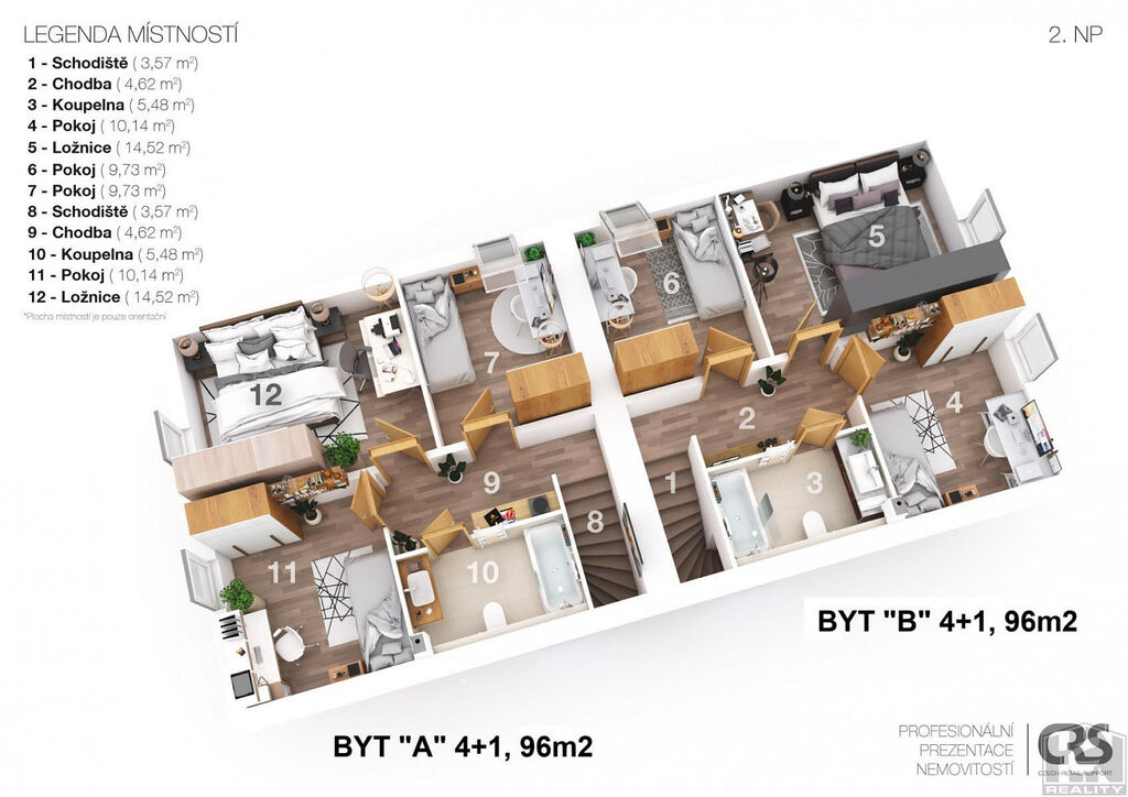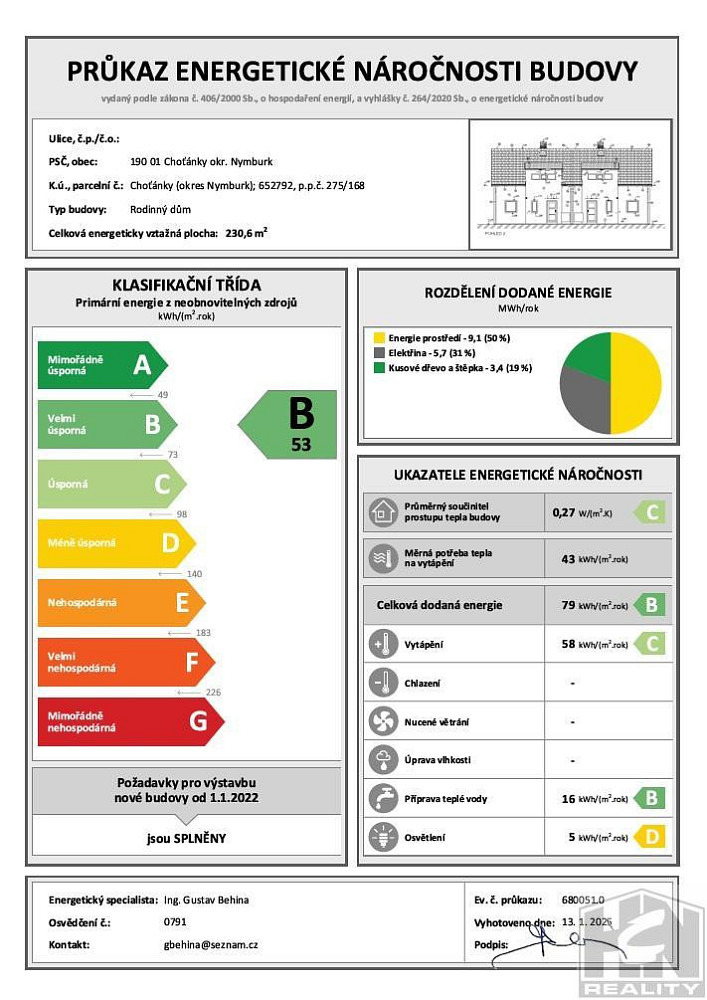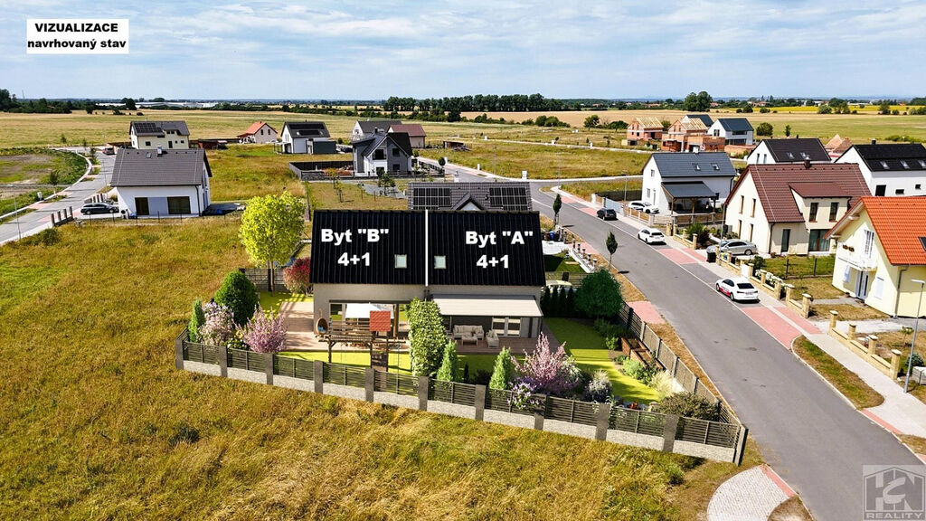 Celková užitná plocha domu 192 m² a zastavěnou plochu o velikosti 118 m². V základním provedení je dům koncipován jako 2x 4+1. V obou částech dvojdomu A a B se nachází v 1. NP praktická vstupní hala, velký obývací pokoj propojený s kuchyní a jídelnou, pohodlné schodiště vedoucí do 2. NP na horní galerii s přímým vstupem do prosvětlené ložnice a dvou útulných dětských pokojů. Dům bude stavebně dokončen včetně vytápění, obkladů, dlažeb, sanitární keramiky, podlahových krytin a vnitřních dveří. Vytápění je řešeno tepelným čerpadlem , Energetický průkaz PENB třida: B. Možnost zajištění stavby domu na klíč. Bližší informace u makléře.