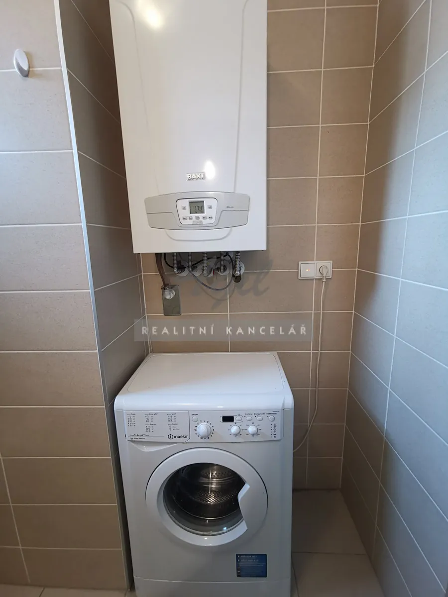 Koupelna – umyvadlo, nástěnné zrcadlo s osvětlením, sprchový kout, WC, přípojka na pračku, pračka, plynový kotel.