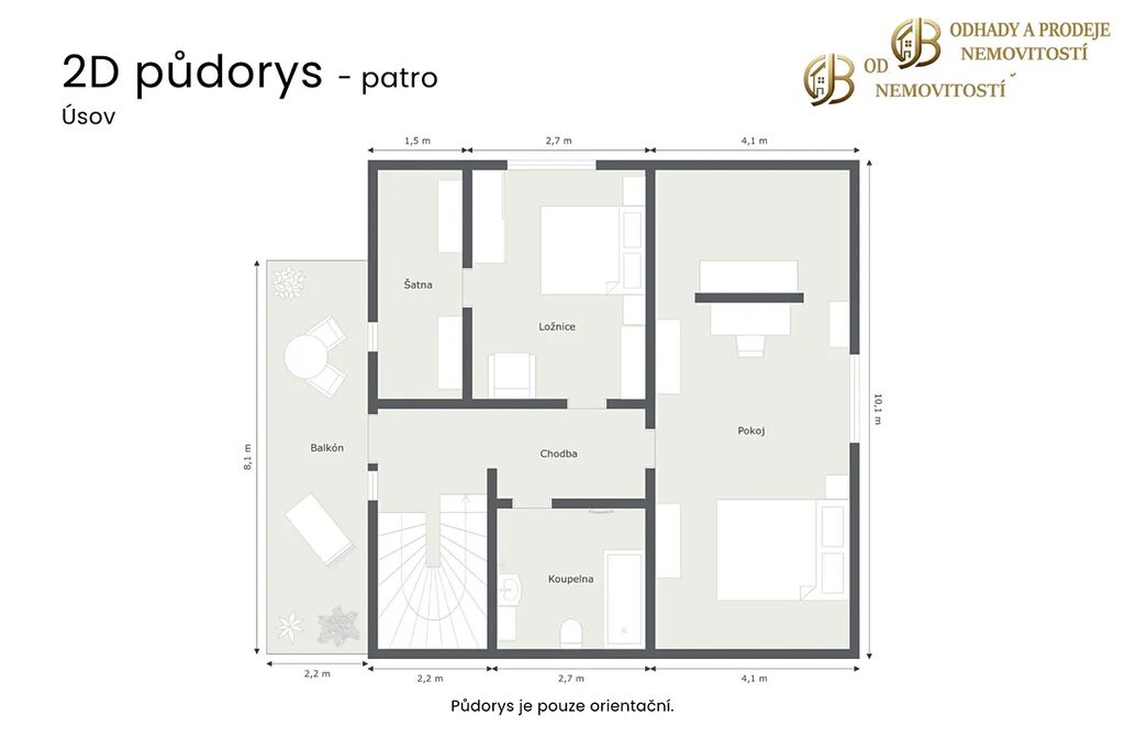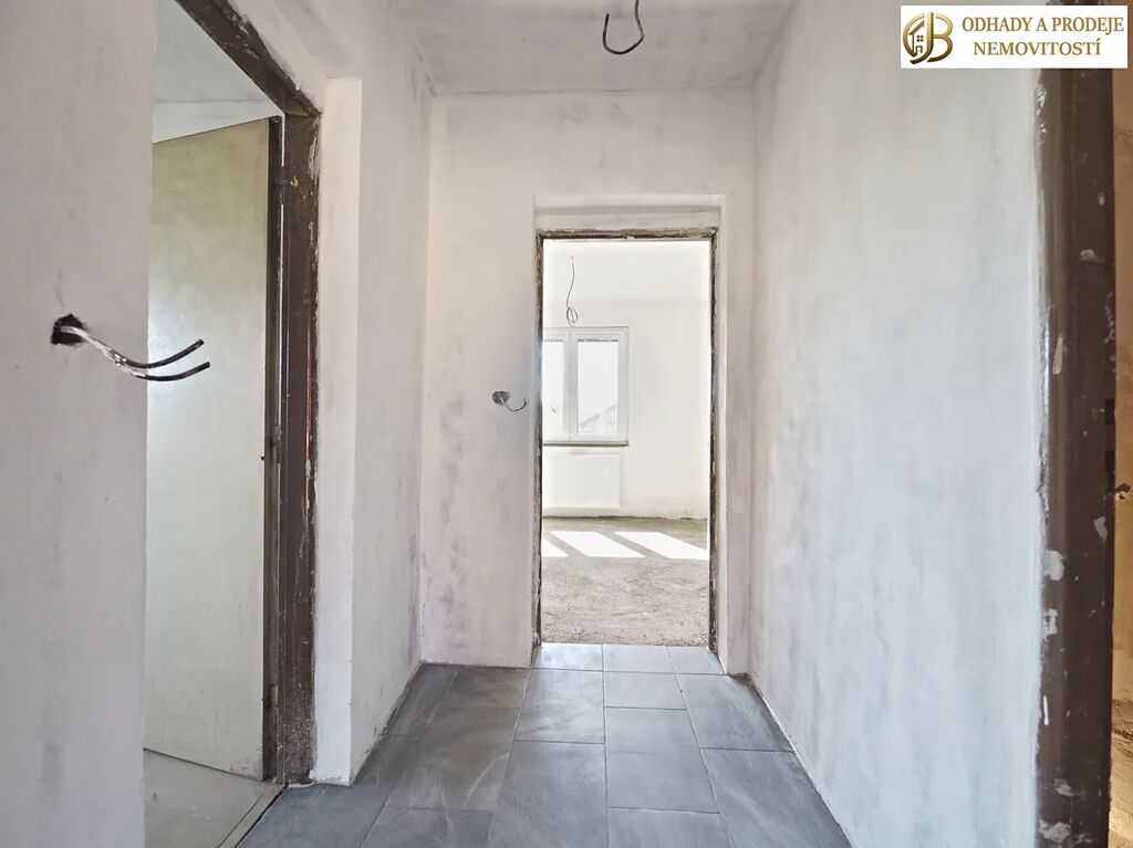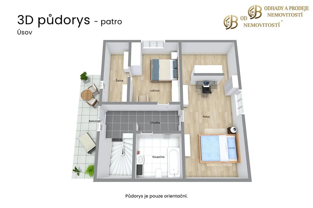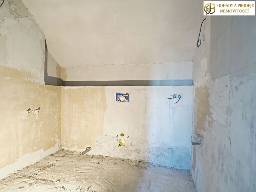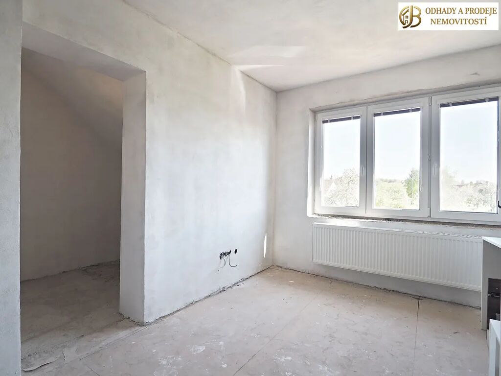 Druhé podlaží nabízí dva pokoje v pokročilé fázi rekonstrukce a připravenou koupelnu k dokončení dle vlastních představ. Odtud je také přístup na rozměrnou terasu s výhledem do zahrady.