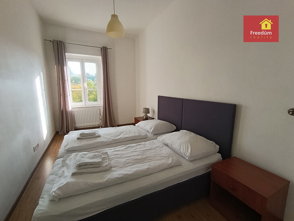 Prostorný byt v podkroví vily, osobní vlastnictví. V bytě jsou dvě oddělené ložnice, obývací pokoj je spojen s kuchyní, k dispozici je koupelna se sprchovým koutem a WC, další WC zvlášť. Byt se prodává zařízený. K bytu náleží sklep o velikosti 25.6 m2.