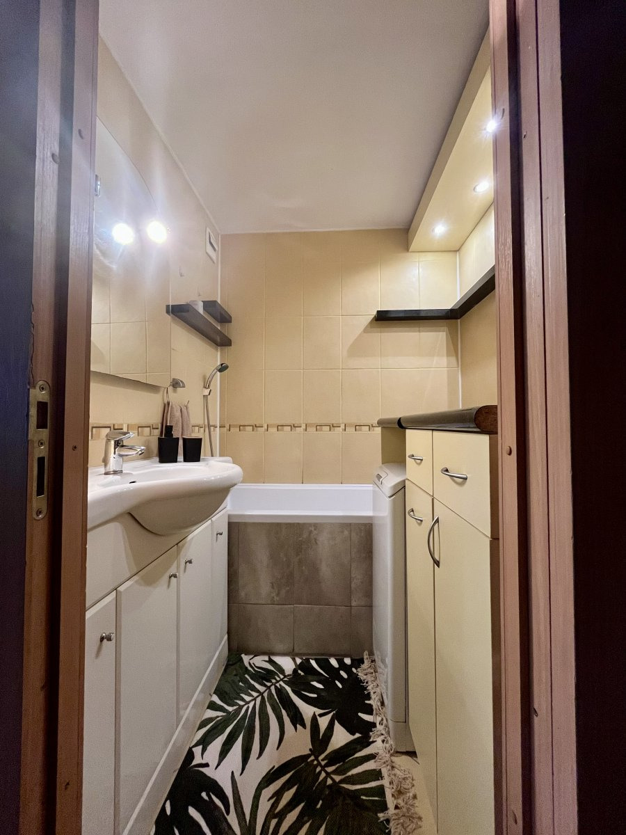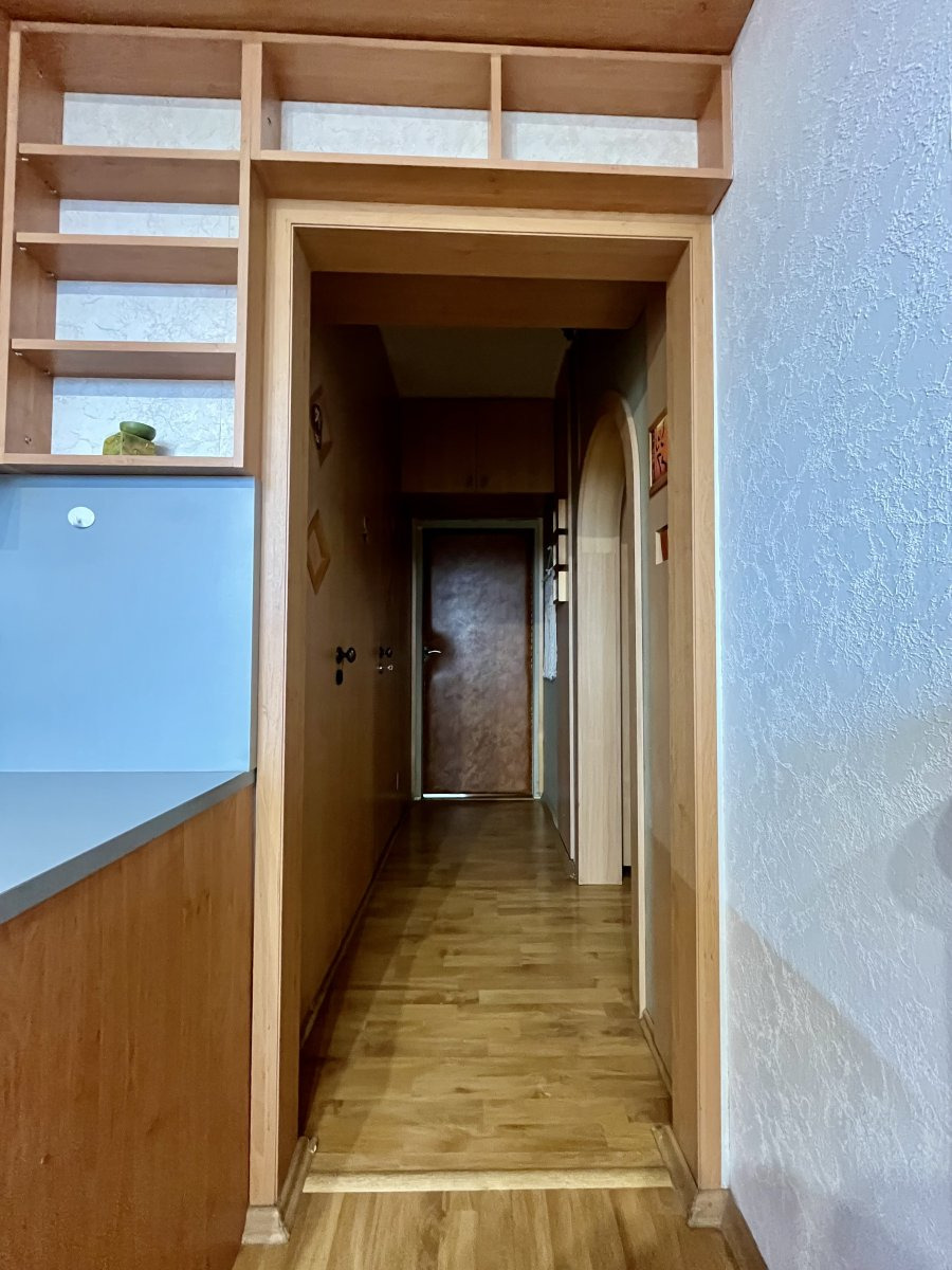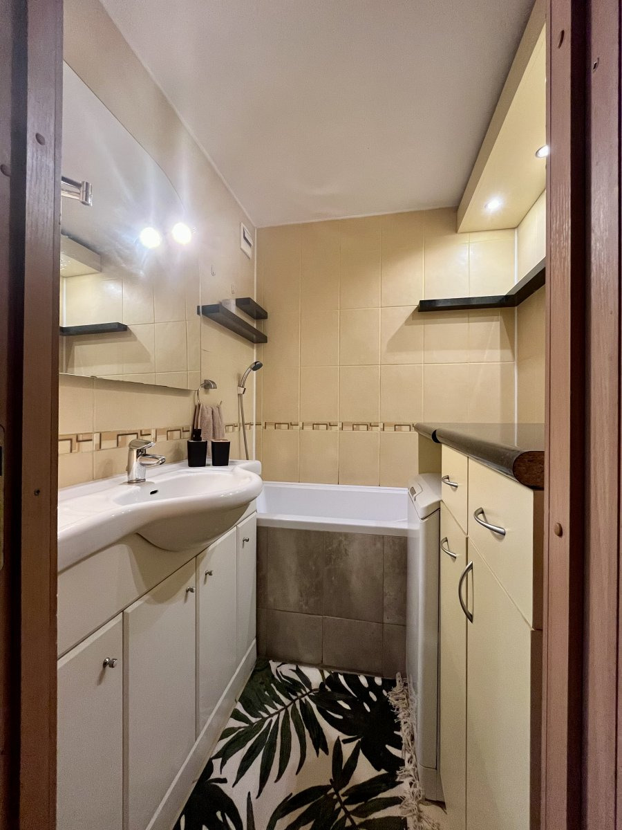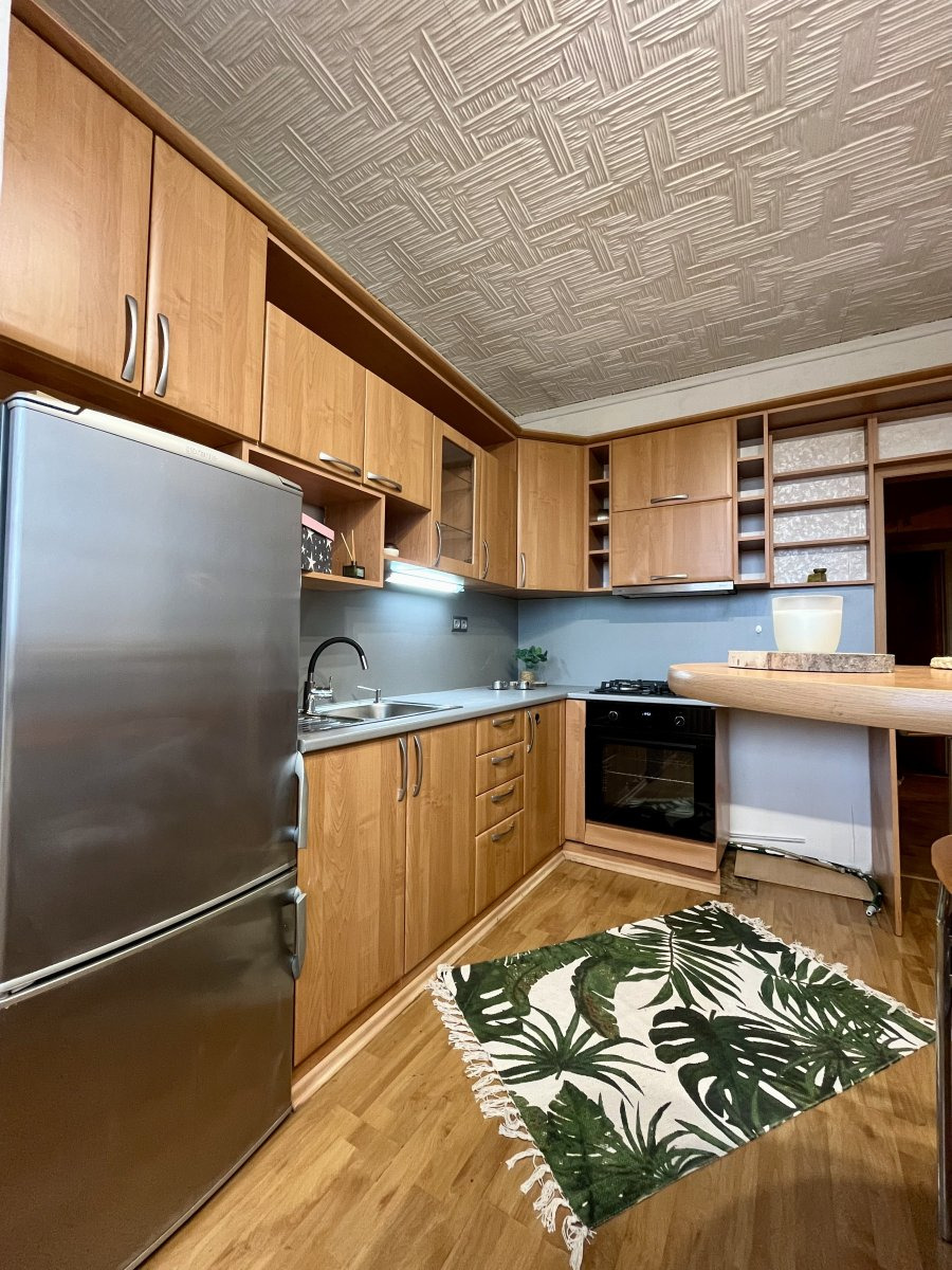 Byt se nabízí částečně vybavený. Kuchyně disponuje plynovým sporákem a elektrickou troubou s digestoří, lednicí a prostorem na připojení myčky. Je zde také barový stůl s židlemi. Pokoje jsou samostatné a neprůchozí. Z jednoho z nich vstupujeme na balkon a má šatní skříně a velkou manželskou postel. Druhý je vybavený vestavěnými skříněmi. V chodbě je také spoustu úložného prostoru, také malý schovaný kumbál. V obývacím pokoji je nábytek a televize. Koupelna je umístěna samostatně s vanou a pračkou. Toaleta je umístěna zvlášť.